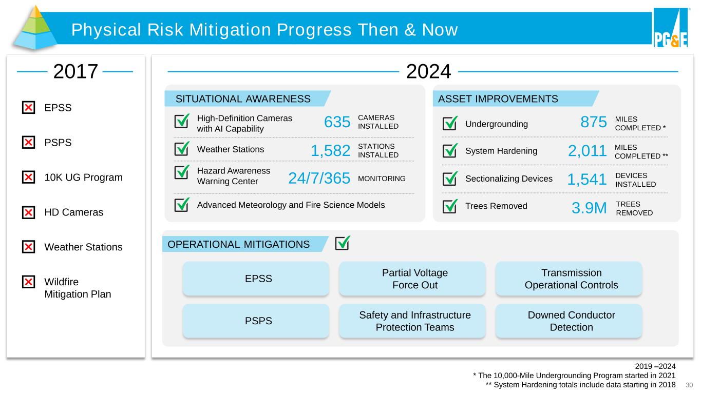 30 Physical Risk Mitigation Progress Then & Now 2017 EPSS PSPS 10K UG Program HD Cameras Weather Stations Wildfire Mitigation Plan SITUATIONAL AWARENESS High-Definition Cameras with AI Capability Weather Stations Hazard Awareness Warning Center Advanced Meteorology and Fire Science Models 635 CAMERAS INSTALLED 1,582 STATIONS INSTALLED 24/7/365 MONITORING ASSET IMPROVEMENTS Undergrounding System Hardening Sectionalizing Devices Trees Removed 875 MILES COMPLETED * 2,011 MILES COMPLETED ** 1,541 DEVICES INSTALLED 3.9M TREES REMOVED OPERATIONAL MITIGATIONS EPSS PSPS Partial Voltage Force Out Safety and Infrastructure Protection Teams Transmission Operational Controls Downed Conductor Detection 2019 –2024 * The 10,000-Mile Undergrounding Program started in 2021 ** System Hardening totals include data starting in 2018 2024
