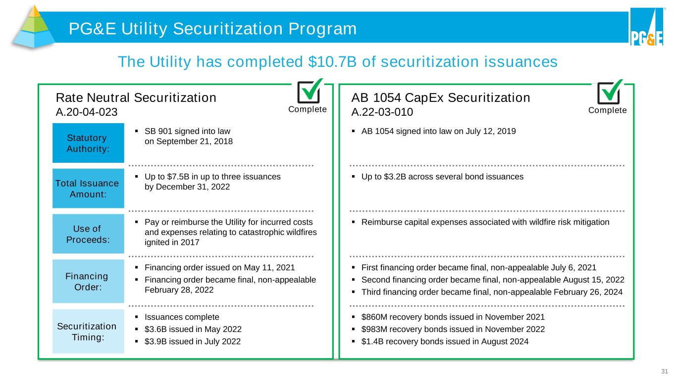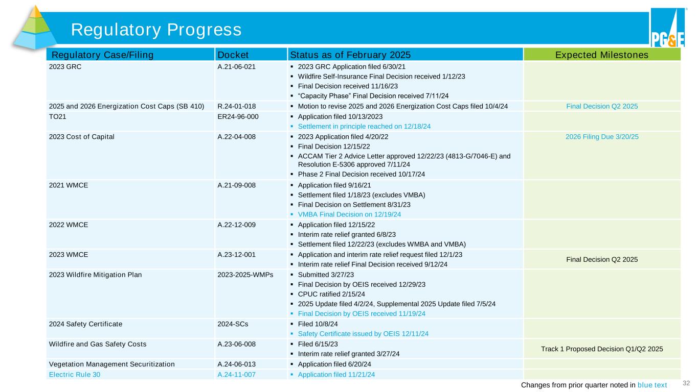 31 PG&E Utility Securitization Program The Utility has completed $10.7B of securitization issuances Rate Neutral Securitization A.20-04-023 ▪ SB 901 signed into law on September 21, 2018Statutory Authority: ▪ AB 1054 signed into law on July 12, 2019 ▪ Up to $7.5B in up to three issuances by December 31, 2022Total Issuance Amount: ▪ Up to $3.2B across several bond issuances ▪ Pay or reimburse the Utility for incurred costs and expenses relating to catastrophic wildfires ignited in 2017 Use of Proceeds: ▪ Reimburse capital expenses associated with wildfire risk mitigation ▪ Financing order issued on May 11, 2021 ▪ Financing order became final, non-appealable February 28, 2022 Financing Order: ▪ First financing order became final, non-appealable July 6, 2021 ▪ Second financing order became final, non-appealable August 15, 2022 ▪ Third financing order became final, non-appealable February 26, 2024 ▪ Issuances complete ▪ $3.6B issued in May 2022 ▪ $3.9B issued in July 2022 Securitization Timing: ▪ $860M recovery bonds issued in November 2021 ▪ $983M recovery bonds issued in November 2022 ▪ $1.4B recovery bonds issued in August 2024 AB 1054 CapEx Securitization A.22-03-010Complete Complete