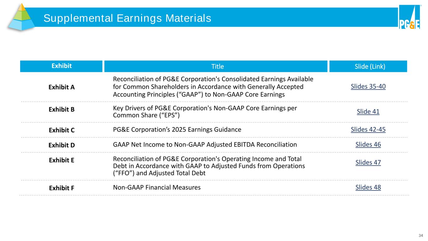 34 Supplemental Earnings Materials Exhibit Title Slide (Link) Exhibit A Reconciliation of PG&E Corporation's Consolidated Earnings Available for Common Shareholders in Accordance with Generally Accepted Accounting Principles (“GAAP”) to Non-GAAP Core Earnings Slides 35-40 Exhibit B Key Drivers of PG&E Corporation's Non-GAAP Core Earnings per Common Share (“EPS”) Slide 41 Exhibit C PG&E Corporation’s 2025 Earnings Guidance Slides 42-45 Exhibit D GAAP Net Income to Non-GAAP Adjusted EBITDA Reconciliation Slides 46 Exhibit E Reconciliation of PG&E Corporation's Operating Income and Total Debt in Accordance with GAAP to Adjusted Funds from Operations (“FFO”) and Adjusted Total Debt Slides 47 Exhibit F Non-GAAP Financial Measures Slides 48