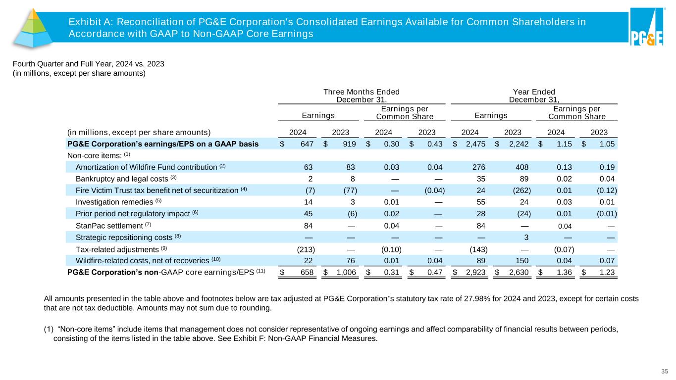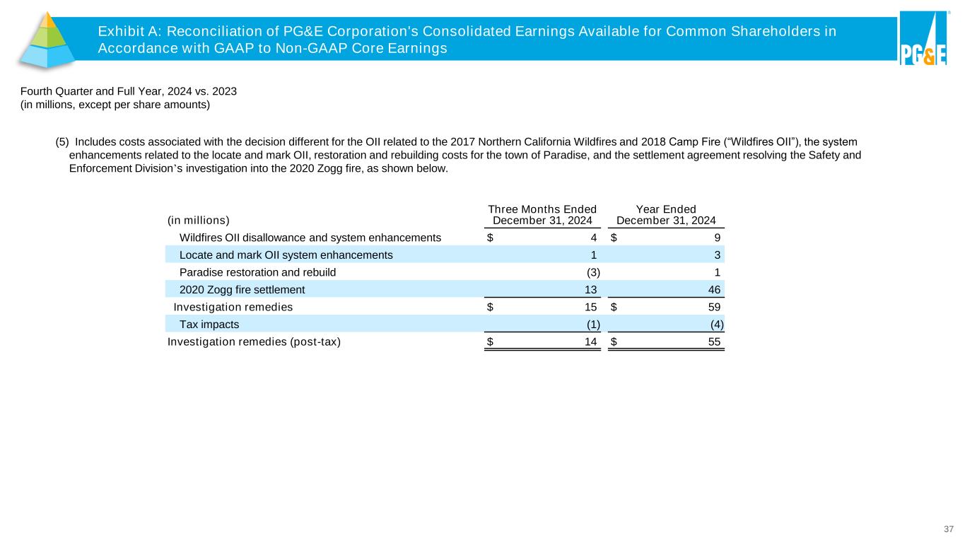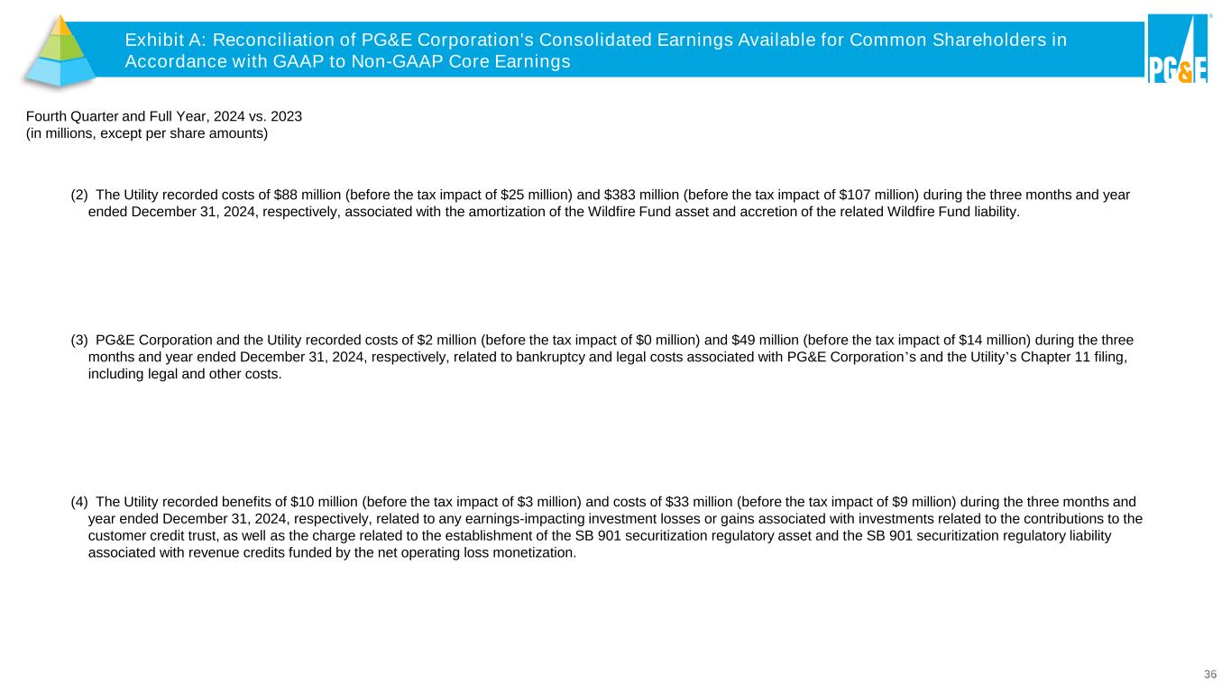 36 Fourth Quarter and Full Year, 2024 vs. 2023 (in millions, except per share amounts) (3) PG&E Corporation and the Utility recorded costs of $2 million (before the tax impact of $0 million) and $49 million (before the tax impact of $14 million) during the three months and year ended December 31, 2024, respectively, related to bankruptcy and legal costs associated with PG&E Corporation’s and the Utility’s Chapter 11 filing, including legal and other costs. (2) The Utility recorded costs of $88 million (before the tax impact of $25 million) and $383 million (before the tax impact of $107 million) during the three months and year ended December 31, 2024, respectively, associated with the amortization of the Wildfire Fund asset and accretion of the related Wildfire Fund liability. Exhibit A: Reconciliation of PG&E Corporation's Consolidated Earnings Available for Common Shareholders in Accordance with Generally Accepted Accounting Principles ("GAAP") to Non-GAAP Core Earnings (4) The Utility recorded benefits of $10 million (before the tax impact of $3 million) and costs of $33 million (before the tax impact of $9 million) during the three months and year ended December 31, 2024, respectively, related to any earnings-impacting investment losses or gains associated with investments related to the contributions to the customer credit trust, as well as the charge related to the establishment of the SB 901 securitization regulatory asset and the SB 901 securitization regulatory liability associated with revenue credits funded by the net operating loss monetization. Exhibit A: Reconciliation of PG&E Corporation's Consolidated Earnings Available for Common Shareholders in Accordance with GAAP to Non-GAAP Core Earnings