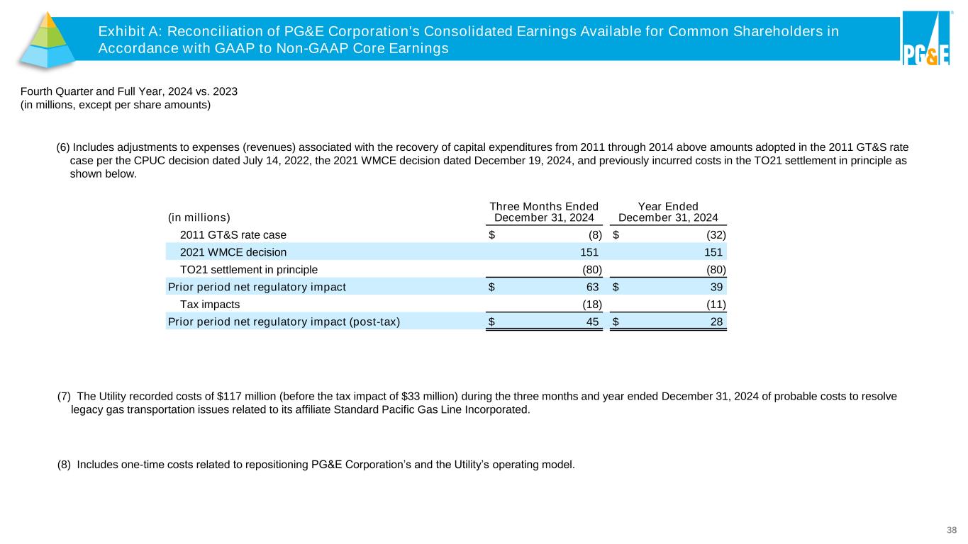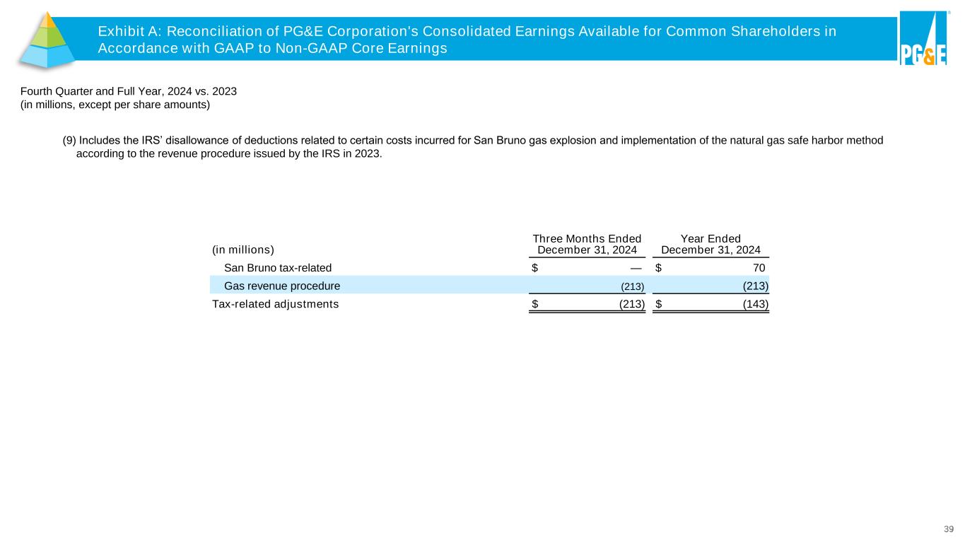38 Fourth Quarter and Full Year, 2024 vs. 2023 (in millions, except per share amounts) (in millions) Three Months Ended December 31, 2024 Year Ended December 31, 2024 2011 GT&S rate case $ (8) $ (32) 2021 WMCE decision 151 151 TO21 settlement in principle (80) (80) Prior period net regulatory impact $ 63 $ 39 Tax impacts (18) (11) Prior period net regulatory impact (post-tax) $ 45 $ 28 Exhibit A: Reconciliation of PG&E Corporation's Consolidated Earnings Available for Common Shareholders in Accordance with Generally Accepted Accounting Principles ("GAAP") to Non-GAAP Core Earnings (6) Includes adjustments to expenses (revenues) associated with the recovery of capital expenditures from 2011 through 2014 above amounts adopted in the 2011 GT&S rate case per the CPUC decision dated July 14, 2022, the 2021 WMCE decision dated December 19, 2024, and previously incurred costs in the TO21 settlement in principle as shown below. Exhibit A: Reconciliation of PG&E Corporation's Consolidated Earnings Available for Common Shareholders in Accordance with GAAP to Non-GAAP Core Earnings (8) Includes one-time costs related to repositioning PG&E Corporation’s and the Utility’s operating model. (7) The Utility recorded costs of $117 million (before the tax impact of $33 million) during the three months and year ended December 31, 2024 of probable costs to resolve legacy gas transportation issues related to its affiliate Standard Pacific Gas Line Incorporated.