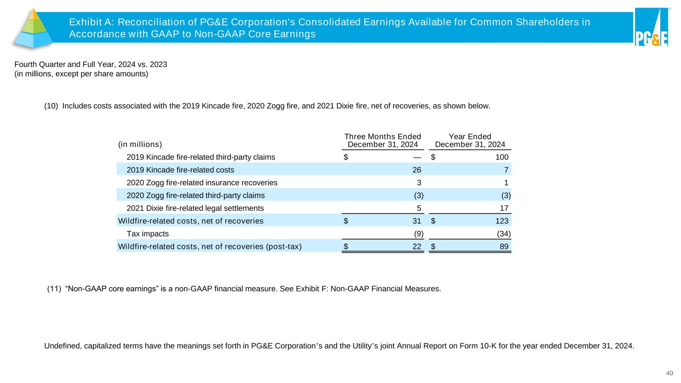 40 Fourth Quarter and Full Year, 2024 vs. 2023 (in millions, except per share amounts) (11) “Non-GAAP core earnings” is a non-GAAP financial measure. See Exhibit F: Non-GAAP Financial Measures. Undefined, capitalized terms have the meanings set forth in PG&E Corporation’s and the Utility’s joint Annual Report on Form 10-K for the year ended December 31, 2024. (10) Includes costs associated with the 2019 Kincade fire, 2020 Zogg fire, and 2021 Dixie fire, net of recoveries, as shown below. (in millions) Three Months Ended December 31, 2024 Year Ended December 31, 2024 2019 Kincade fire-related third-party claims $ — $ 100 2019 Kincade fire-related costs 26 7 2020 Zogg fire-related insurance recoveries 3 1 2020 Zogg fire-related third-party claims (3) (3) 2021 Dixie fire-related legal settlements 5 17 Wildfire-related costs, net of recoveries $ 31 $ 123 Tax impacts (9) (34) Wildfire-related costs, net of recoveries (post-tax) $ 22 $ 89 Exhibit A: Reconciliation of PG&E Corporation's Consolidated Earnings Available for Common Shareholders in Accordance with Generally Accepted Accounting Principles ("GAAP") to Non-GAAP Core Earnings Exhibit A: Reconciliation of PG&E Corporation's Consolidated Earnings Available for Common Shareholders in Accordance with GAAP to Non-GAAP Core Earnings