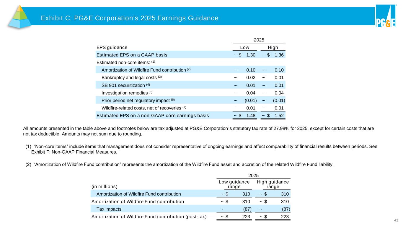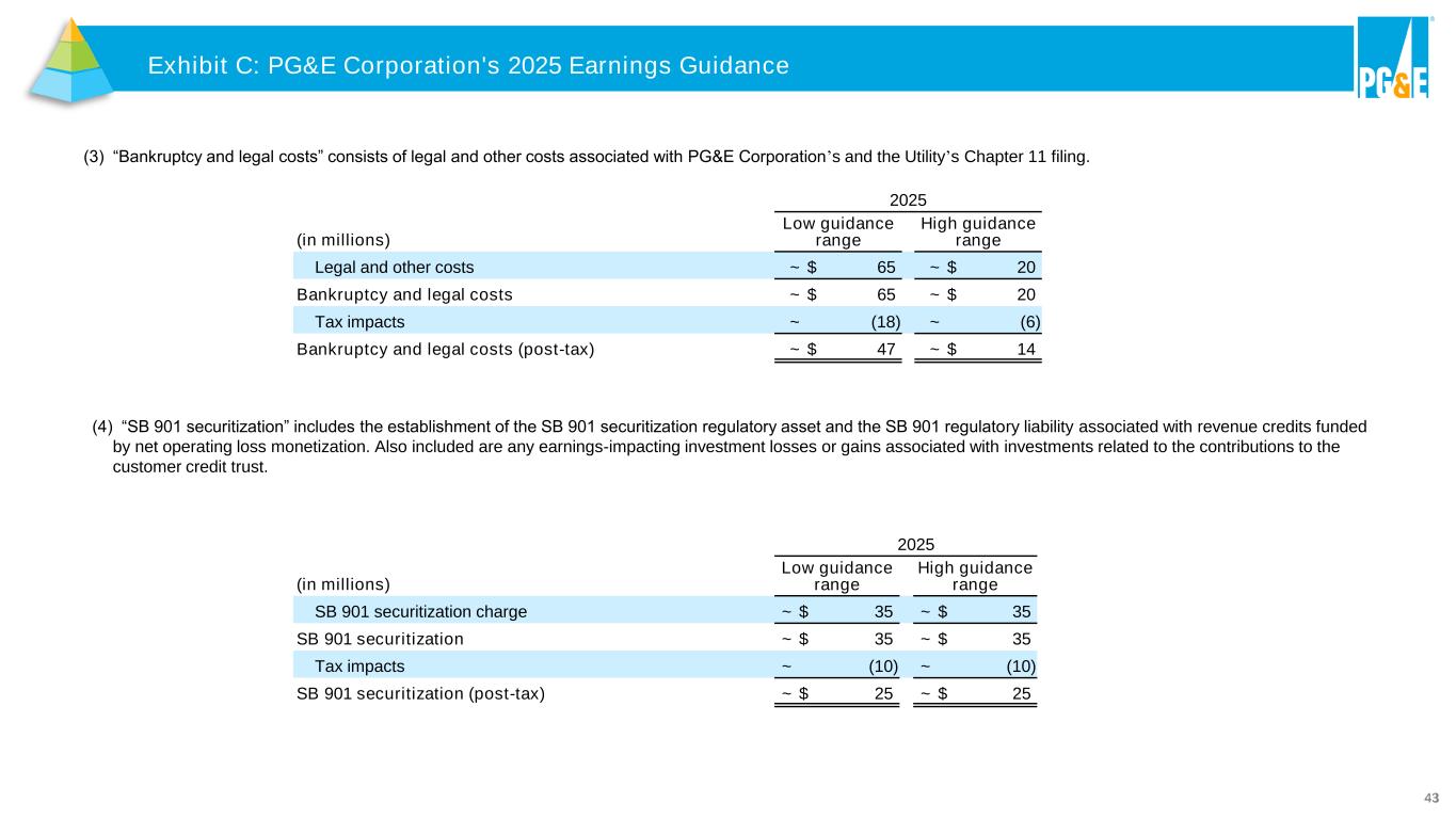 42 2025 EPS guidance Low High Estimated EPS on a GAAP basis ~ $ 1.30 ~ $ 1.36 Estimated non-core items: (1) Amortization of Wildfire Fund contribution (2) ~ 0.10 ~ 0.10 Bankruptcy and legal costs (3) ~ 0.02 ~ 0.01 SB 901 securitization (4) ~ 0.01 ~ 0.01 Investigation remedies (5) ~ 0.04 ~ 0.04 Prior period net regulatory impact (6) ~ (0.01) ~ (0.01) Wildfire-related costs, net of recoveries (7) ~ 0.01 ~ 0.01 Estimated EPS on a non-GAAP core earnings basis ~ $ 1.48 ~ $ 1.52 All amounts presented in the table above and footnotes below are tax adjusted at PG&E Corporation’s statutory tax rate of 27.98% for 2025, except for certain costs that are not tax deductible. Amounts may not sum due to rounding. (1) “Non-core items” include items that management does not consider representative of ongoing earnings and affect comparability of financial results between periods. See Exhibit F: Non-GAAP Financial Measures. 2025 (in millions) Low guidance range High guidance range Amortization of Wildfire Fund contribution ~ $ 310 ~ $ 310 Amortization of Wildfire Fund contribution ~ $ 310 ~ $ 310 Tax impacts ~ (87) ~ (87) Amortization of Wildfire Fund contribution (post-tax) ~ $ 223 ~ $ 223 (2) “Amortization of Wildfire Fund contribution” represents the amortization of the Wildfire Fund asset and accretion of the related Wildfire Fund liability. Exhibit C: PG&E Corporation's 2024 Earnings GuidanceExhibit C: P &E Corporation's 2025 Earnings Guidance