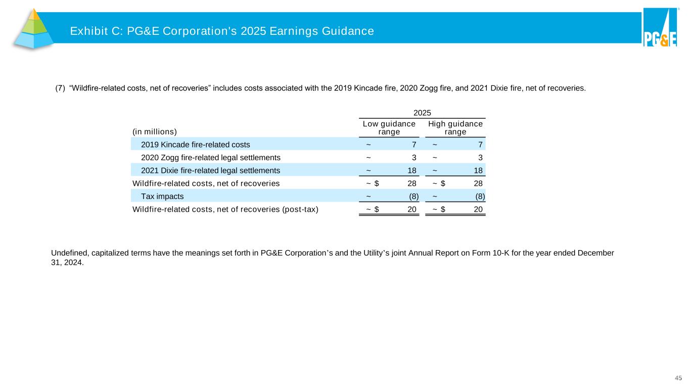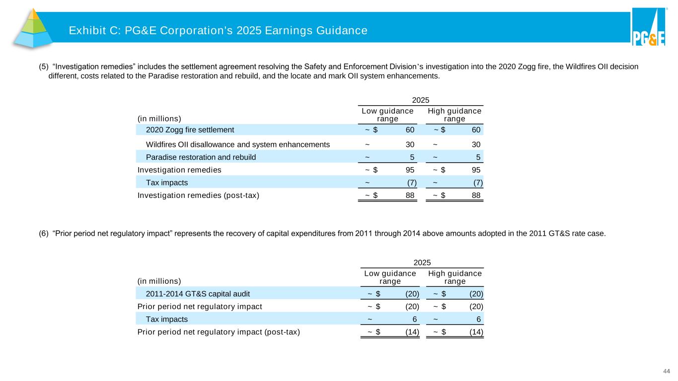 44 (6) “Prior period net regulatory impact” represents the recovery of capital expenditures from 2011 through 2014 above amounts adopted in the 2011 GT&S rate case. (5) “Investigation remedies” includes the settlement agreement resolving the Safety and Enforcement Division’s investigation into the 2020 Zogg fire, the Wildfires OII decision different, costs related to the Paradise restoration and rebuild, and the locate and mark OII system enhancements. 2025 (in millions) Low guidance range High guidance range 2020 Zogg fire settlement ~ $ 60 ~ $ 60 Wildfires OII disallowance and system enhancements ~ 30 ~ 30 Paradise restoration and rebuild ~ 5 ~ 5 Investigation remedies ~ $ 95 ~ $ 95 Tax impacts ~ (7) ~ (7) Investigation remedies (post-tax) ~ $ 88 ~ $ 88 2025 (in millions) Low guidance range High guidance range 2011-2014 GT&S capital audit ~ $ (20) ~ $ (20) Prior period net regulatory impact ~ $ (20) ~ $ (20) Tax impacts ~ 6 ~ 6 Prior period net regulatory impact (post-tax) ~ $ (14) ~ $ (14) Exhibit C: PG&E Corporation's 2024 Earnings GuidanceExhibit C: P &E Corporation's 2025 Earnings Guidance