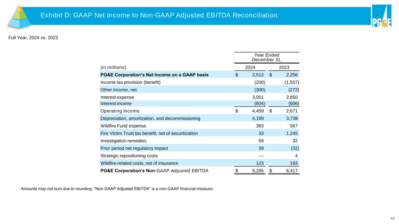 46 Year Ended December 31, (in millions) 2024 2023 PG&E Corporation’s Net Income on a GAAP basis $ 2,512 $ 2,256 Income tax provision (benefit) (200) (1,557) Other income, net (300) (272) Interest expense 3,051 2,850 Interest income (604) (606) Operating Income $ 4,459 $ 2,671 Depreciation, amortization, and decommissioning 4,189 3,738 Wildfire Fund expense 383 567 Fire Victim Trust tax benefit, net of securitization 33 1,245 Investigation remedies 59 32 Prior period net regulatory impact 39 (32) Strategic repositioning costs — 4 Wildfire-related costs, net of insurance 123 193 PG&E Corporation’s Non-GAAP Adjusted EBITDA $ 9,285 $ 8,417 Full Year, 2024 vs. 2023 Amounts may not sum due to rounding. “Non-GAAP Adjusted EBITDA” is a non-GAAP financial measure. Exhibit D: GAAP Net Income to Non-GAAP Adjusted EBITDA Reconciliation PG&E CorporationExhibit D: GAAP Net Income to Non-GAAP Adjusted EBITDA Reconciliation