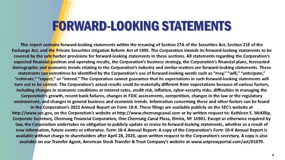 FORWARD - LOOKING STATEMENTS 4 This report contains forward - looking statements within the meaning of Section 27A of the Securities Act, Section 21E of the Exchange Act, and the Private Securities Litigation Reform Act of 1995. The Corporation intends its forward - looking statements to be covered by the safe harbor provisions for forward - looking statements in these sections. All statements regarding the Corporation’s expected financial position and operating results, the Corporation’s business strategy, the Corporation’s financial plans, forecasted demographic and economic trends relating to the Corporation’s industry and similar matters are forward - looking statements. These statements can sometimes be identified by the Corporation’s use of forward - looking words such as “may,” “will,” “anticipate,” “estimate,” “expect,” or “intend.” The Corporation cannot guarantee that its expectations in such forward - looking statements will turn out to be correct. The Corporation’s actual results could be materially different from expectations because of various factors, including changes in economic conditions or interest rates, credit risk, inflation, cyber - security risks, difficulties in managing the Corporation’s growth, recent bank failures, changes in FDIC assessments, competition, changes in the law or the regulatory environment, and changes in general business and economic trends. Information concerning these and other factors can be found in the Corporation’s 2022 Annual Report on Form 10 - K. These filings are available publicly on the SEC’s website at http://www.sec.gov, on the Corporation’s website at http://www.chemungcanal.com or by written request to: Kathleen S. McKillip, Corporate Secretary, Chemung Financial Corporation, One Chemung Canal Plaza, Elmira, NY 14901. Except as otherwise required by law, the Corporation undertakes no obligation to publicly update or revise its forward - looking statements, whether as a result of new information, future events or otherwise. Form 10 - K Annual Report: A copy of the Corporation’s Form 10 - K Annual Report is available without charge to shareholders after April 28, 2023, upon written request to the Corporation’s secretary. A copy is also available on our Transfer Agent, American Stock Transfer & Trust Company’s website at www.astproxyportal.com/ast/01079.