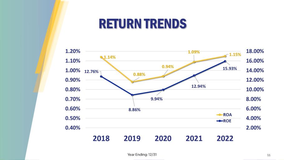 RETURN TRENDS 1.14% 0.88% 0.94% 1.09% 1.15% 12.76% 8.86% 9.94% 12.94% 15.93% 18.00% 16.00% 14.00% 12.00% 10.00% 8.00% 6.00% 4.00% 2.00% 1.20% 1.10% 1.00% 0.90% 0.80% 0.70% 0.60% 0.50% 0.40% 2018 2019 2020 2021 2022 ROA ROE 11