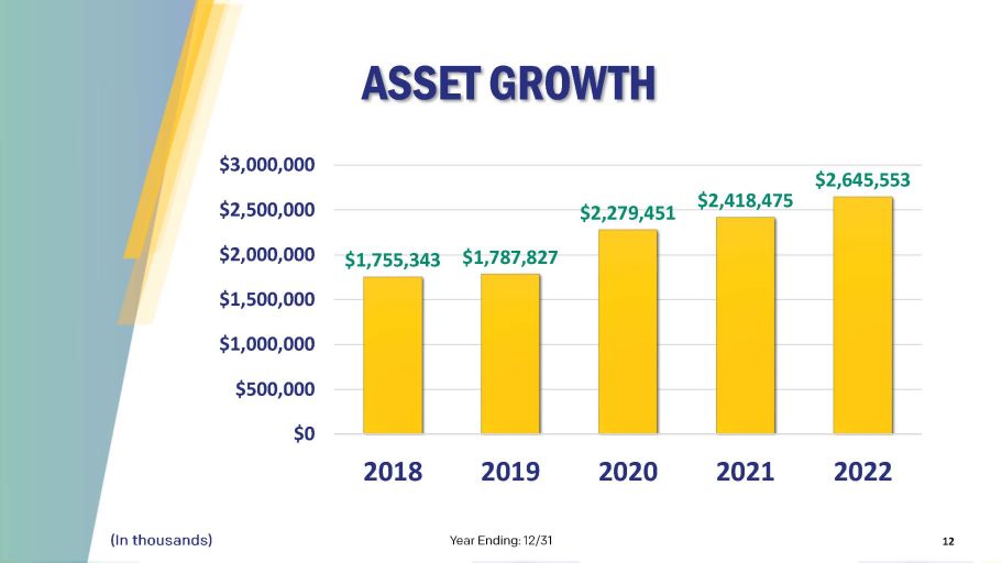 ASSET GROWTH $1,755,343 $1,787,827 $2,279,451 $2,418,475 $2,645,553 $1,500,000 $1,000,000 $500,000 $0 $2,000,000 $2,500,000 $3,000,000 2018 2019 2020 2021 2022 12
