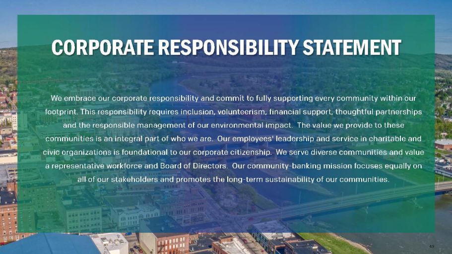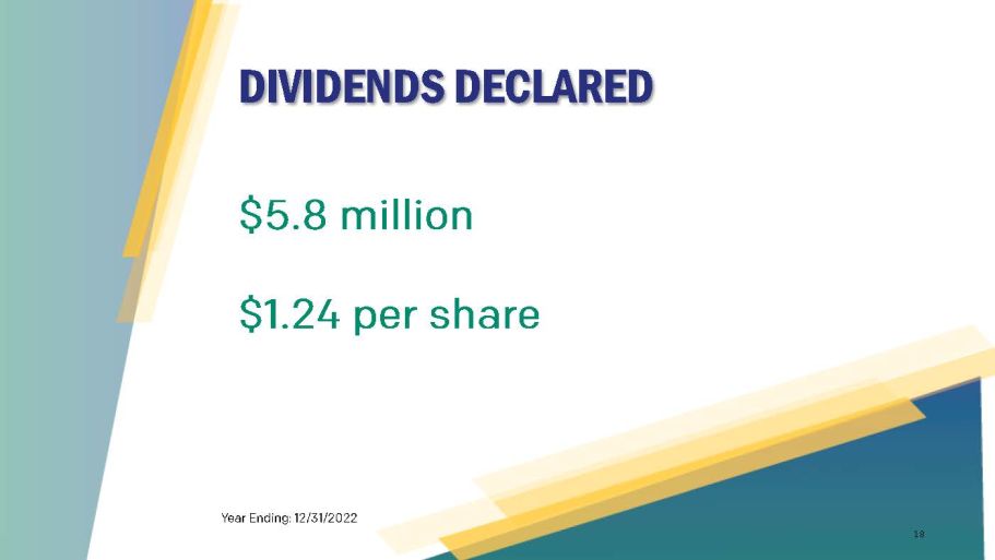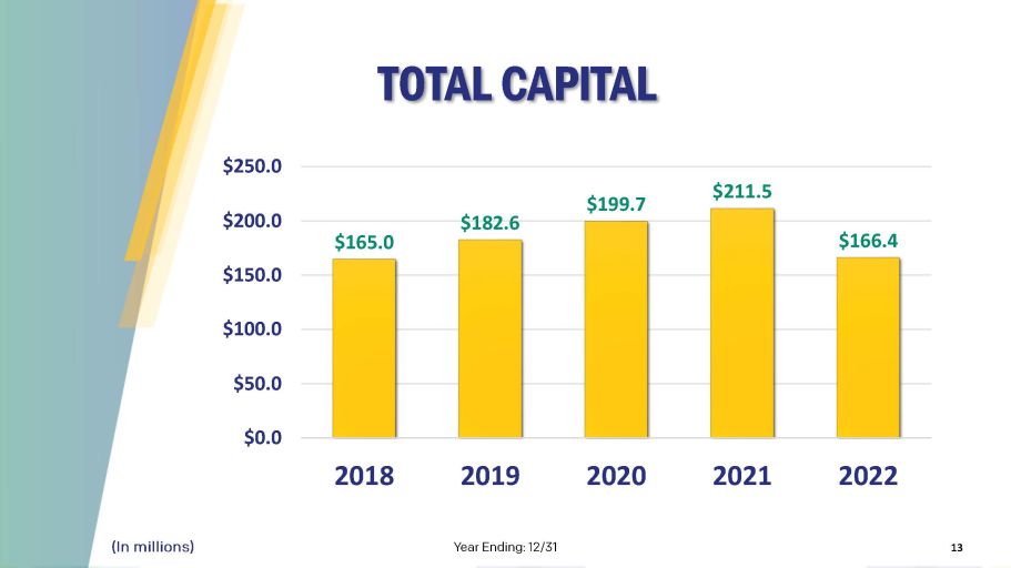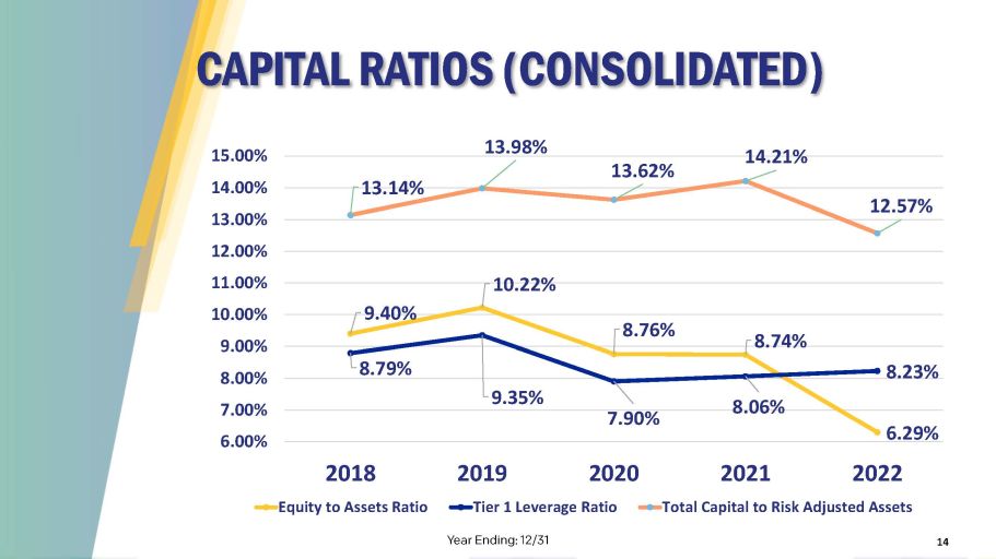CAPITAL RATIOS (CONSOLIDATED) 9.40% 10.22% 8.76% 8.74% 8.79% 9.35% 7.90% 8.06% 8.23% 13.14% 13.98% 13.62% 14.21% 12.57% 15.00% 14.00% 13.00% 12.00% 11.00% 10.00% 9.00% 8.00% 7.00% 6.00% 6.29% 2021 2022 2018 Equity to Assets Ratio 2019 2020 Tier 1 Leverage Ratio Total Capital to Risk Adjusted Assets 14