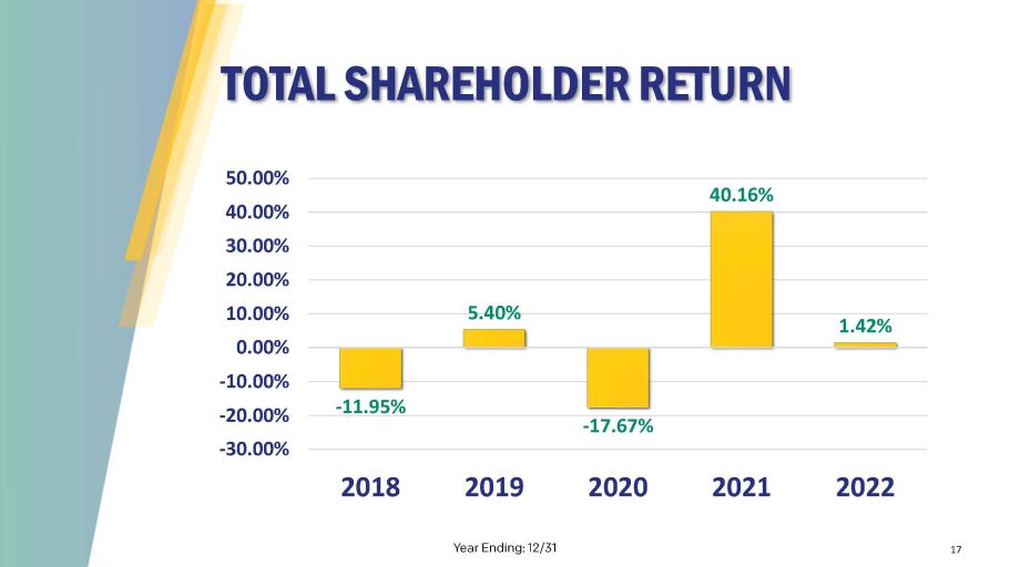 TOTAL SHAREHOLDER RETURN 17 - 11.95% 5.40% - 17.67% 40.16% 1.42% 50.00% 40.00% 30.00% 20.00% 10.00% 0.00% - 10.00% - 20.00% - 30.00% 2018 2019 2020 2021 2022