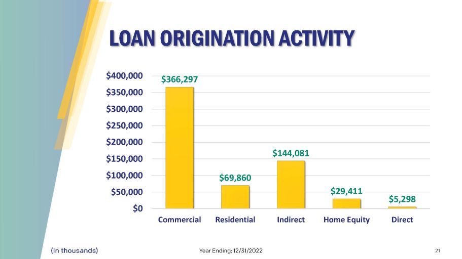 LOAN ORIGINATION ACTIVITY $366,297 $69,860 $144,081 $29,411 $5,298 $400,000 $350,000 $300,000 $250,000 $200,000 $150,000 $100,000 $50,000 $0 Commercial Residential Indirect Home Equity Direct