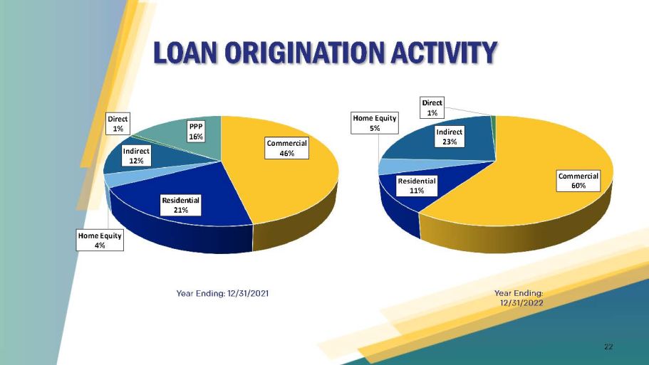LOAN ORIGINATION ACTIVITY Commercial 46% Residential 21% Home Equity 4% Indirect 12% Direct 1% PPP 16% Commercial 60% Residential 11% Home Equity 5% Indirect 23% Direct 1%