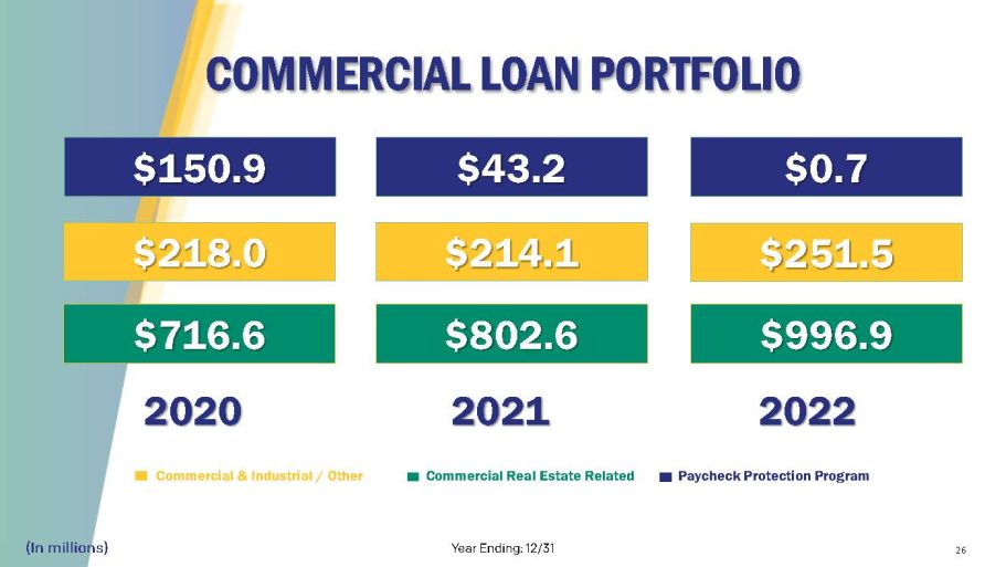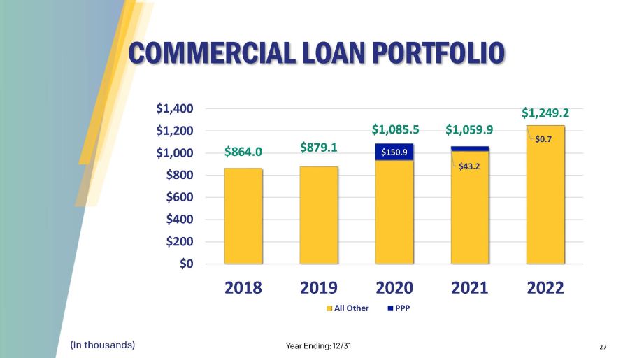 COMMERCIAL LOAN PORTFOLIO $0.7 $43.2 $150.9 $251.5 $214.1 $218.0 $996.9 $802.6 $716.6 2022 2021 2020 Paycheck Protection Program Commercial Real Estate Related Commercial & Industrial / Other 26