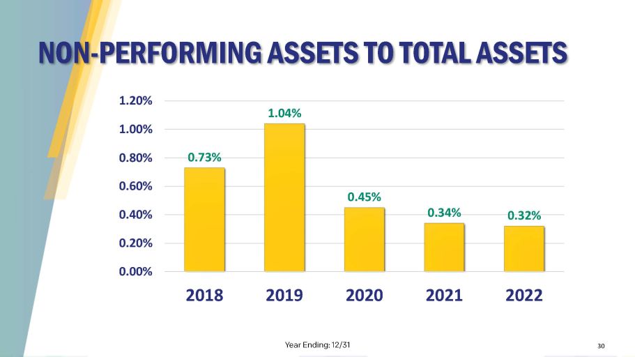 NON - PERFORMING ASSETS TO TOTAL ASSETS 0.73% 30 1.04% 0.45% 0.34% 0.32% 0.20% 0.00% 0.40% 0.60% 0.80% 1.00% 1.20% 2018 2019 2020 2021 2022