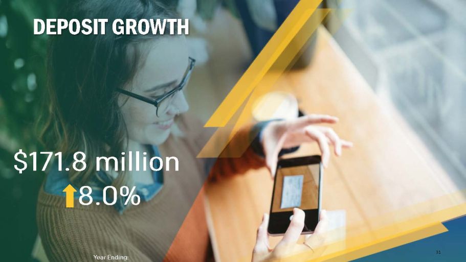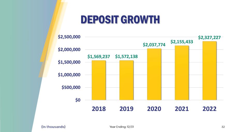 DEPOSIT GROWTH $1,569,237 $1,572,138 $2,037,774 $2,155,433 $2,327,227 $1,500,000 $1,000,000 $500,000 $0 $2,000,000 $2,500,000 2018 2019 2020 2021 2022