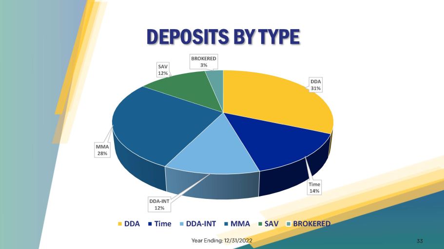 DEPOSITS BY TYPE DDA 31% Time 14% DDA - INT 12% MMA 28% SAV 12% BROKERED 3% DDA Time DDA - INT MMA SAV BROKERED