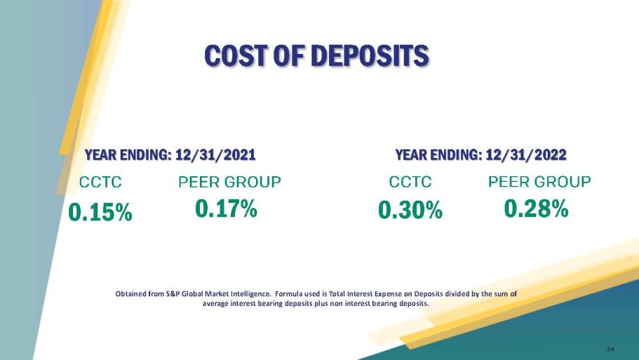 0.32% 0.36% YEAR ENDING: 12/31/2021 YEAR ENDING: 12/31/2022 COST OF FUNDS 0.16% 0.26% 35 Peer Group data represents the median. Obtained from S&P Global Market Intelligence. The percentage is the total interest expense as a percent of the sum of average interest bearing liabilities and average noninterest bearing deposits, obtained from the Federal Reserve FR Y - 9C reports of the consolidated financial statements for Holding Companies.