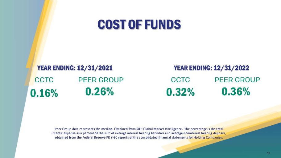 0.30% 0.28% YEAR ENDING: 12/31/2021 YEAR ENDING: 12/31/2022 COST OF DEPOSITS 0.15% 0.17% 34 Obtained from S&P Global Market Intelligence. Formula used is Total Interest Expense on Deposits divided by the sum of average interest bearing deposits plus non interest bearing deposits.