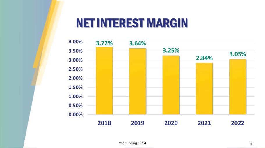 NET INTEREST MARGIN 3.72% 3.64% 36 3.25% 2.84% 3.05% 4.00% 3.50% 3.00% 2.50% 2.00% 1.50% 1.00% 0.50% 0.00% 2018 2019 2020 2021 2022