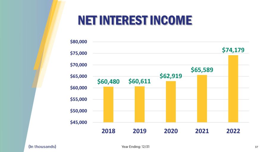 NET INTEREST INCOME $60,480 37 $60,611 $62,919 $65,589 $74,179 $60,000 $55,000 $50,000 $45,000 $65,000 $70,000 $75,000 $80,000 2018 2019 2020 2021 2022
