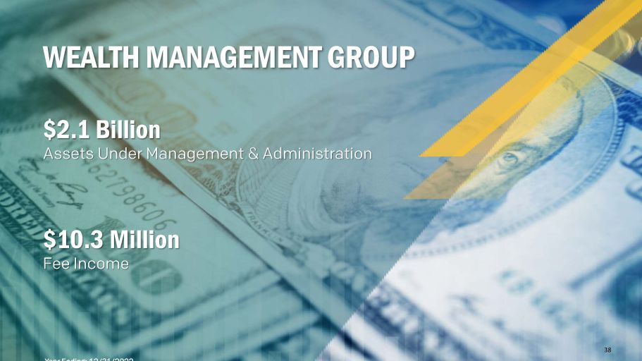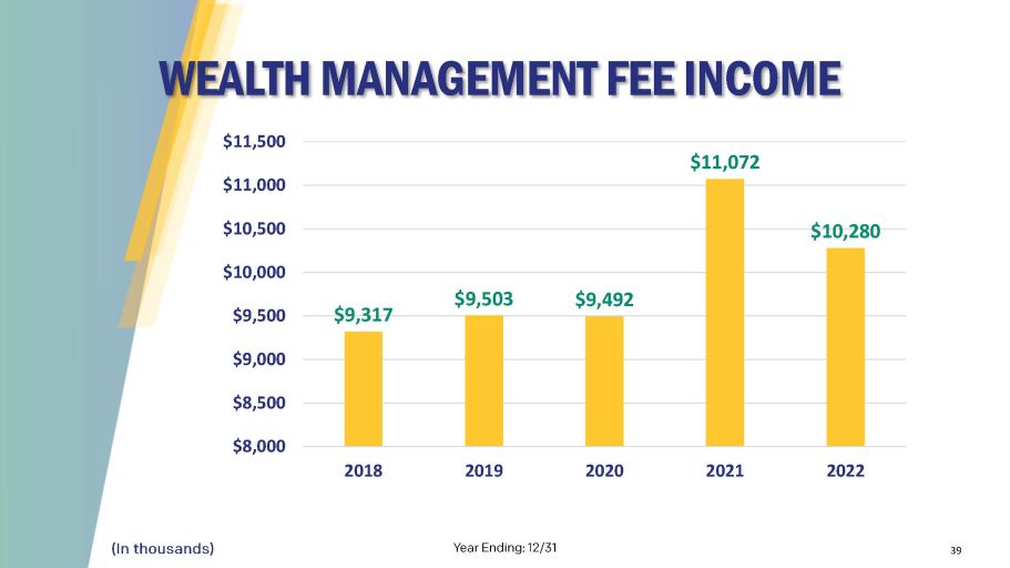 WEALTH MANAGEMENT FEE INCOME $9,317 39 $9,503 $9,492 $11,072 $10,280 $9,000 $8,500 $8,000 $9,500 $10,000 $10,500 $11,000 $11,500 2018 2019 2020 2021 2022
