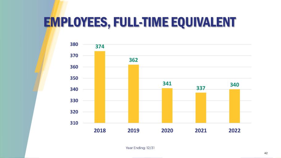 EMPLOYEES, FULL - TIME EQUIVALENT 374 362 341 337 340 330 320 310 340 360 350 370 380 2018 2019 2020 2021 2022 42