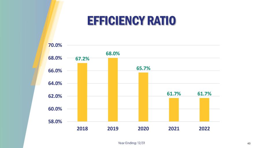 EFFICIENCY RATIO 67.2% 68.0% 65.7% 61.7% 61.7% 60.0% 58.0% 62.0% 64.0% 66.0% 68.0% 70.0% 2018 2019 2020 2021 2022 43