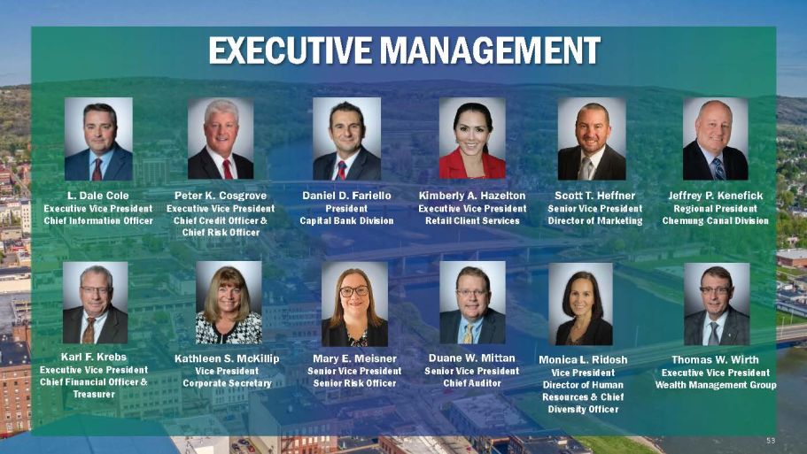 EXECUTIVE MANAGEMENT L. Dale Cole Executive Vice President Chief Information Officer Daniel D. Fariello President Capital Bank Division 53 Kimberly A. Hazelton Executive Vice President Retail Client Services Scott T. Heffner Senior Vice President Director of Marketing Kathleen S. McKillip Vice President Corporate Secretary Karl F. Krebs Executive Vice President Chief Financial Officer & Treasurer Thomas W. Wirth Executive Vice President Wealth Management Group Duane W. Mittan Senior Vice President Chief Auditor Peter K. Cosgrove Executive Vice President Chief Credit Officer & Chief Risk Officer Mary E. Meisner Senior Vice President Senior Risk Officer Jeffrey P. Kenefick Regional President Chemung Canal Division Monica L. Ridosh Vice President Director of Human Resources & Chief Diversity Officer