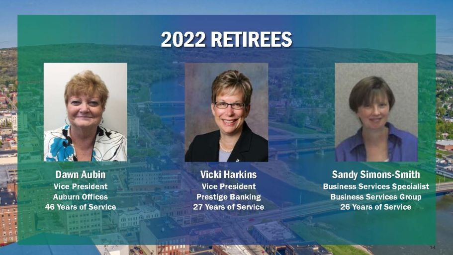 2022 RETIREES Dawn Aubin Vice President Auburn Offices 46 Years of Service Sandy Simons - Smith Business Services Specialist Business Services Group 26 Years of Service Vicki Harkins Vice President Prestige Banking 27 Years of Service 54