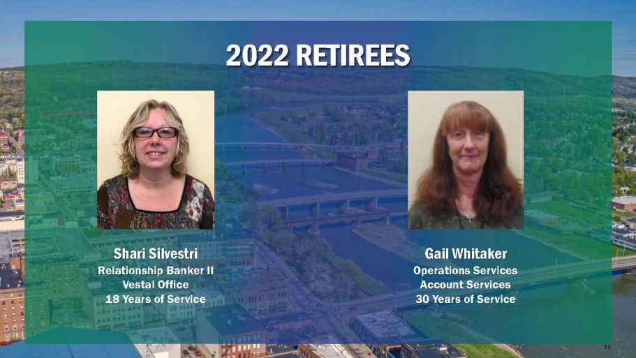 2022 RETIREES Shari Silvestri Relationship Banker II Vestal Office 18 Years of Service Gail Whitaker Operations Services Account Services 30 Years of Service 55