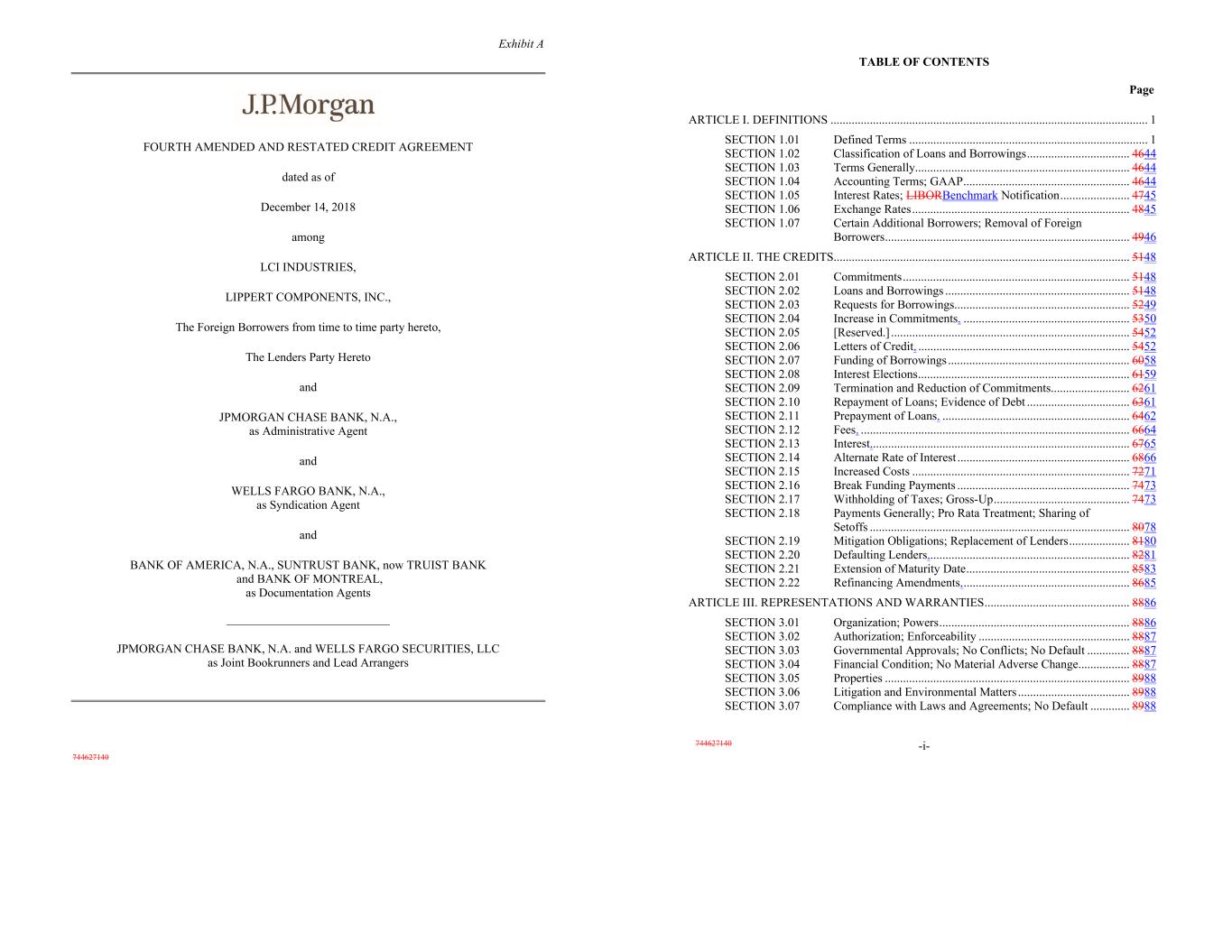 Exhibit A 744627140 FOURTH AMENDED AND RESTATED CREDIT AGREEMENT dated as of December 14, 2018 among LCI INDUSTRIES, LIPPERT COMPONENTS, INC., The Foreign Borrowers from time to time party hereto, The Lenders Party Hereto and JPMORGAN CHASE BANK, N.A., as Administrative Agent and WELLS FARGO BANK, N.A., as Syndication Agent and BANK OF AMERICA, N.A., SUNTRUST BANK, now TRUIST BANK and BANK OF MONTREAL, as Documentation Agents ___________________________ JPMORGAN CHASE BANK, N.A. and WELLS FARGO SECURITIES, LLC as Joint Bookrunners and Lead Arrangers TABLE OF CONTENTS Page 744627140 -i- ARTICLE I. DEFINITIONS ......................................................................................................... 1  SECTION 1.01  Defined Terms ............................................................................... 1  SECTION 1.02  Classification of Loans and Borrowings .................................. 4644  SECTION 1.03  Terms Generally ....................................................................... 4644  SECTION 1.04  Accounting Terms; GAAP ....................................................... 4644  SECTION 1.05  Interest Rates; LIBORBenchmark Notification ....................... 4745  SECTION 1.06  Exchange Rates ........................................................................ 4845  SECTION 1.07  Certain Additional Borrowers; Removal of Foreign Borrowers ................................................................................. 4946  ARTICLE II. THE CREDITS .................................................................................................. 5148  SECTION 2.01  Commitments ........................................................................... 5148  SECTION 2.02  Loans and Borrowings ............................................................. 5148  SECTION 2.03  Requests for Borrowings .......................................................... 5249  SECTION 2.04  Increase in Commitments. ....................................................... 5350  SECTION 2.05  [Reserved.] ............................................................................... 5452  SECTION 2.06  Letters of Credit. ...................................................................... 5452  SECTION 2.07  Funding of Borrowings ............................................................ 6058  SECTION 2.08  Interest Elections ...................................................................... 6159  SECTION 2.09  Termination and Reduction of Commitments.......................... 6261  SECTION 2.10  Repayment of Loans; Evidence of Debt .................................. 6361  SECTION 2.11  Prepayment of Loans. .............................................................. 6462  SECTION 2.12  Fees. ......................................................................................... 6664  SECTION 2.13  Interest...................................................................................... 6765  SECTION 2.14  Alternate Rate of Interest ......................................................... 6866  SECTION 2.15  Increased Costs ........................................................................ 7271  SECTION 2.16  Break Funding Payments ......................................................... 7473  SECTION 2.17  Withholding of Taxes; Gross-Up ............................................. 7473  SECTION 2.18  Payments Generally; Pro Rata Treatment; Sharing of Setoffs ...................................................................................... 8078  SECTION 2.19  Mitigation Obligations; Replacement of Lenders .................... 8180  SECTION 2.20  Defaulting Lenders. .................................................................. 8281  SECTION 2.21  Extension of Maturity Date ...................................................... 8583  SECTION 2.22  Refinancing Amendments. ....................................................... 8685  ARTICLE III. REPRESENTATIONS AND WARRANTIES ................................................ 8886  SECTION 3.01  Organization; Powers ............................................................... 8886  SECTION 3.02  Authorization; Enforceability .................................................. 8887  SECTION 3.03  Governmental Approvals; No Conflicts; No Default .............. 8887  SECTION 3.04  Financial Condition; No Material Adverse Change................. 8887  SECTION 3.05  Properties ................................................................................. 8988  SECTION 3.06  Litigation and Environmental Matters ..................................... 8988  SECTION 3.07  Compliance with Laws and Agreements; No Default ............. 8988