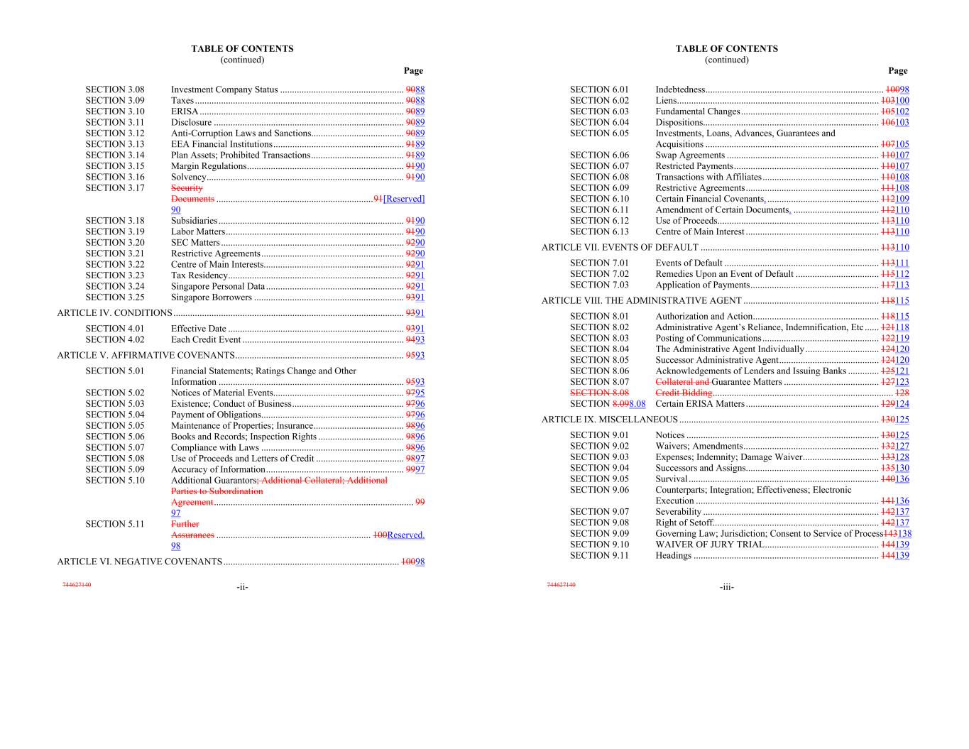 TABLE OF CONTENTS (continued) Page 744627140 -ii- SECTION 3.08  Investment Company Status .................................................... 9088  SECTION 3.09  Taxes ........................................................................................ 9088  SECTION 3.10  ERISA ...................................................................................... 9089  SECTION 3.11  Disclosure ................................................................................ 9089  SECTION 3.12  Anti-Corruption Laws and Sanctions....................................... 9089  SECTION 3.13  EEA Financial Institutions ....................................................... 9189  SECTION 3.14  Plan Assets; Prohibited Transactions ....................................... 9189  SECTION 3.15  Margin Regulations .................................................................. 9190  SECTION 3.16  Solvency ................................................................................... 9190  SECTION 3.17  Security Documents .................................................................. 91[Reserved] 90  SECTION 3.18  Subsidiaries .............................................................................. 9190  SECTION 3.19  Labor Matters ........................................................................... 9190  SECTION 3.20  SEC Matters ............................................................................. 9290  SECTION 3.21  Restrictive Agreements ............................................................ 9290  SECTION 3.22  Centre of Main Interests........................................................... 9291  SECTION 3.23  Tax Residency .......................................................................... 9291  SECTION 3.24  Singapore Personal Data .......................................................... 9291  SECTION 3.25  Singapore Borrowers ............................................................... 9391  ARTICLE IV. CONDITIONS ................................................................................................. 9391  SECTION 4.01  Effective Date .......................................................................... 9391  SECTION 4.02  Each Credit Event .................................................................... 9493  ARTICLE V. AFFIRMATIVE COVENANTS ....................................................................... 9593  SECTION 5.01  Financial Statements; Ratings Change and Other Information .............................................................................. 9593  SECTION 5.02  Notices of Material Events....................................................... 9795  SECTION 5.03  Existence; Conduct of Business ............................................... 9796  SECTION 5.04  Payment of Obligations ............................................................ 9796  SECTION 5.05  Maintenance of Properties; Insurance ...................................... 9896  SECTION 5.06  Books and Records; Inspection Rights .................................... 9896  SECTION 5.07  Compliance with Laws ............................................................ 9896  SECTION 5.08  Use of Proceeds and Letters of Credit ..................................... 9897  SECTION 5.09  Accuracy of Information .......................................................... 9997  SECTION 5.10  Additional Guarantors; Additional Collateral; Additional Parties to Subordination Agreement .................................................................................... 99 97  SECTION 5.11  Further Assurances ................................................................. 100Reserved. 98  ARTICLE VI. NEGATIVE COVENANTS .......................................................................... 10098  TABLE OF CONTENTS (continued) Page 744627140 -iii- SECTION 6.01  Indebtedness ........................................................................... 10098  SECTION 6.02  Liens ..................................................................................... 103100  SECTION 6.03  Fundamental Changes .......................................................... 105102  SECTION 6.04  Dispositions.......................................................................... 106103  SECTION 6.05  Investments, Loans, Advances, Guarantees and Acquisitions ......................................................................... 107105  SECTION 6.06  Swap Agreements ................................................................ 110107  SECTION 6.07  Restricted Payments ............................................................. 110107  SECTION 6.08  Transactions with Affiliates ................................................. 110108  SECTION 6.09  Restrictive Agreements ........................................................ 111108  SECTION 6.10  Certain Financial Covenants. ............................................... 112109  SECTION 6.11  Amendment of Certain Documents. .................................... 112110  SECTION 6.12  Use of Proceeds .................................................................... 113110  SECTION 6.13  Centre of Main Interest ........................................................ 113110  ARTICLE VII. EVENTS OF DEFAULT ........................................................................... 113110  SECTION 7.01  Events of Default ................................................................. 113111  SECTION 7.02  Remedies Upon an Event of Default ................................... 115112  SECTION 7.03  Application of Payments ...................................................... 117113  ARTICLE VIII. THE ADMINISTRATIVE AGENT ......................................................... 118115  SECTION 8.01  Authorization and Action ..................................................... 118115  SECTION 8.02  Admi
