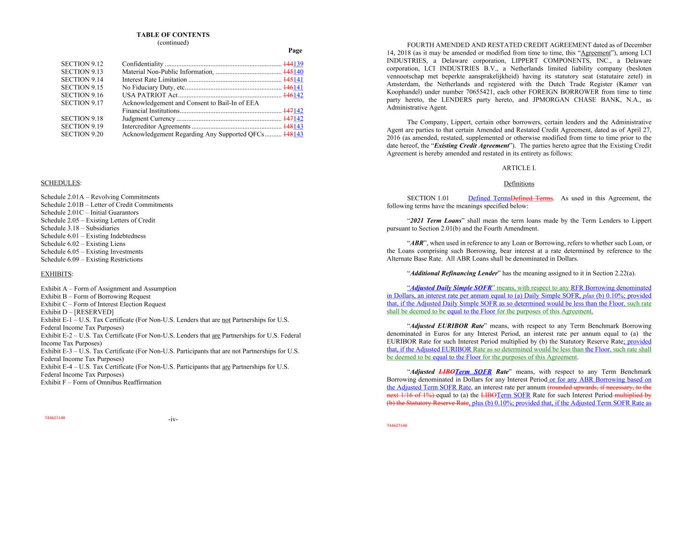 TABLE OF CONTENTS (continued) Page 744627140 -iv- SECTION 9.12  Confidentiality ..................................................................... 144139  SECTION 9.13  Material Non-Public Information. ....................................... 145140  SECTION 9.14  Interest Rate Limitation ....................................................... 145141  SECTION 9.15  No Fiduciary Duty, etc ......................................................... 146141  SECTION 9.16  USA PATRIOT Act ............................................................. 146142  SECTION 9.17  Acknowledgement and Consent to Bail-In of EEA Financial Institutions ............................................................ 147142  SECTION 9.18  Judgment Currency .............................................................. 147142  SECTION 9.19  Intercreditor Agreements ..................................................... 148143  SECTION 9.20  Acknowledgement Regarding Any Supported QFCs .......... 148143  SCHEDULES: Schedule 2.01A – Revolving Commitments Schedule 2.01B – Letter of Credit Commitments Schedule 2.01C – Initial Guarantors Schedule 2.05 – Existing Letters of Credit Schedule 3.18 – Subsidiaries Schedule 6.01 – Existing Indebtedness Schedule 6.02 – Existing Liens Schedule 6.05 – Existing Investments Schedule 6.09 – Existing Restrictions EXHIBITS: Exhibit A – Form of Assignment and Assumption Exhibit B – Form of Borrowing Request Exhibit C – Form of Interest Election Request Exhibit D – [RESERVED] Exhibit E-1 – U.S. Tax Certificate (For Non-U.S. Lenders that are not Partnerships for U.S. Federal Income Tax Purposes) Exhibit E-2 – U.S. Tax Certificate (For Non-U.S. Lenders that are Partnerships for U.S. Federal Income Tax Purposes) Exhibit E-3 – U.S. Tax Certificate (For Non-U.S. Participants that are not Partnerships for U.S. Federal Income Tax Purposes) Exhibit E-4 – U.S. Tax Certificate (For Non-U.S. Participants that are Partnerships for U.S. Federal Income Tax Purposes) Exhibit F – Form of Omnibus Reaffirmation 744627140 FOURTH AMENDED AND RESTATED CREDIT AGREEMENT dated as of December 14, 2018 (as it may be amended or modified from time to time, this “Agreement”), among LCI INDUSTRIES, a Delaware corporation, LIPPERT COMPONENTS, INC., a Delaware corporation, LCI INDUSTRIES B.V., a Netherlands limited liability company (besloten vennootschap met beperkte aansprakelijkheid) having its statutory seat (statutaire zetel) in Amsterdam, the Netherlands and registered with the Dutch Trade Register (Kamer van Koophandel) under number 70655421, each other FOREIGN BORROWER from time to time party hereto, the LENDERS party hereto, and JPMORGAN CHASE BANK, N.A., as Administrative Agent. The Company, Lippert, certain other borrowers, certain lenders and the Administrative Agent are parties to that certain Amended and Restated Credit Agreement, dated as of April 27, 2016 (as amended, restated, supplemented or otherwise modified from time to time prior to the date hereof, the “Existing Credit Agreement”). The parties hereto agree that the Existing Credit Agreement is hereby amended and restated in its entirety as follows: ARTICLE I. Definitions SECTION 1.01 Defined TermsDefined Terms. As used in this Agreement, the following terms have the meanings specified below: “2021 Term Loans” shall mean the term loans made by the Term Lenders to Lippert pursuant to Section 2.01(b) and the Fourth Amendment. “ABR”, when used in reference to any Loan or Borrowing, refers to whether such Loan, or the Loans comprising such Borrowing, bear interest at a rate determined by reference to the Alternate Base Rate. All ABR Loans shall be denominated in Dollars. “Additional Refinancing Lender” has the meaning assigned to it in Section 2.22(a). “Adjusted Daily Simple SOFR” means, with respect to any RFR Borrowing denominated in Dollars, an interest rate per annum equal to (a) Daily Simple SOFR, plus (b) 0.10%; provided that, if the Adjusted Daily Simple SOFR as so determined would be less than the Floor, such rate shall be deemed to be equal to the Floor for the purposes of this Agreement. “Adjusted EURIBOR Rate” means, with respect to any Term Benchmark Borrowing denominated in Euros for any Interest Period, an interest rate per annum equal to (a) the EURIBOR Rate for such Interest Period multiplied by (b) the Statutory Reserve Rate; provided that, if the Adjusted EURIBOR Rate as so determined would be less than the Floor, such rate shall be deemed to be equal to the Floor for the purposes of this Agreement. “Adjusted LIBOTerm SOFR Rate” means, with respect to any Term Benchmark Borrowing denominated in Dollars for any Interest Period or for any ABR Borrowing based on the Adjusted Term SOFR Rate, an interest rate per annum (rounded upwards, if necessary, to the next 1/16 of 1%) equal to (a) the LIBOTerm SOFR Rate for such Interest Period multiplied by (b) the Statutory Reserve Rate, plus (b) 0.10%; provided that, if the Adjusted Term SOFR Rate as