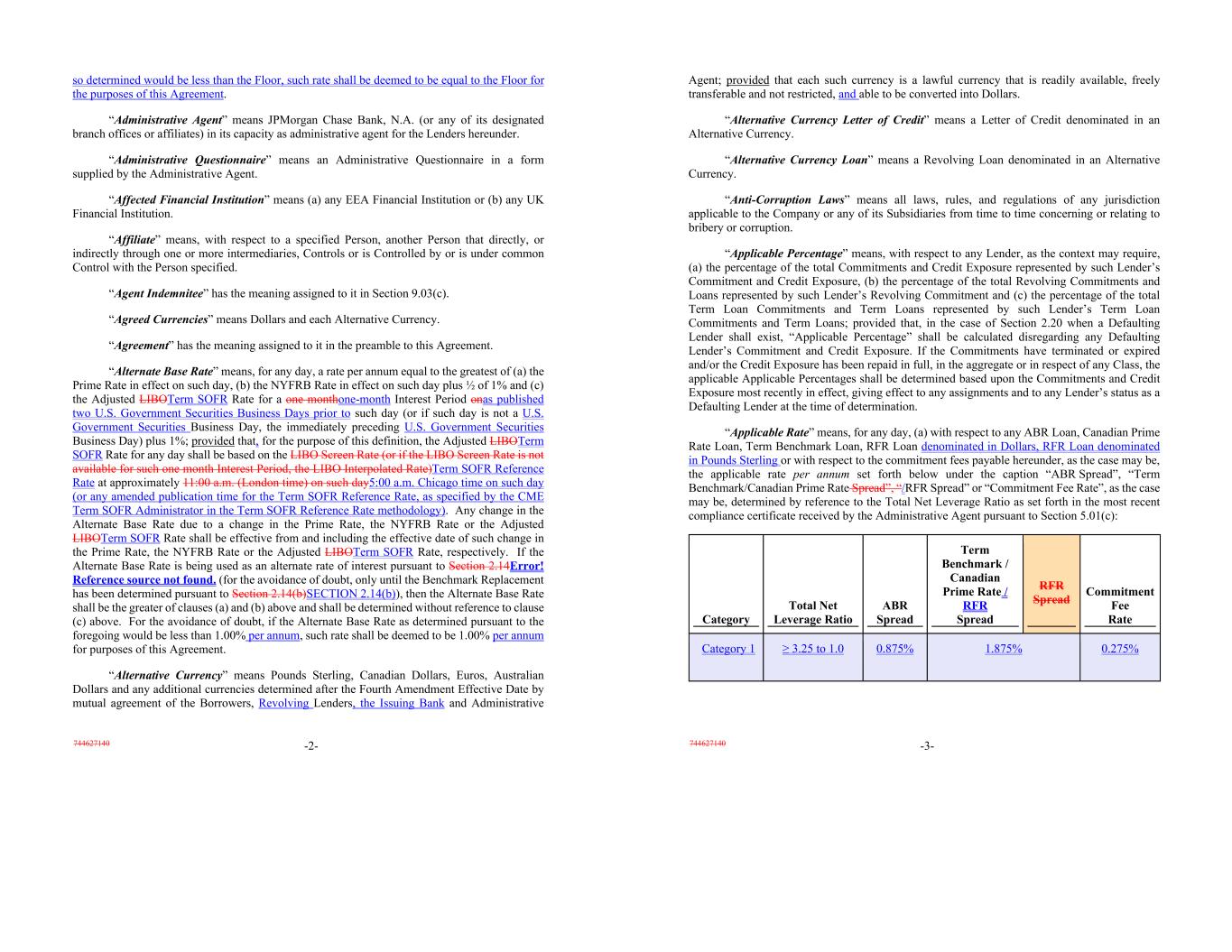 744627140 -2- so determined would be less than the Floor, such rate shall be deemed to be equal to the Floor for the purposes of this Agreement. “Administrative Agent” means JPMorgan Chase Bank, N.A. (or any of its designated branch offices or affiliates) in its capacity as administrative agent for the Lenders hereunder. “Administrative Questionnaire” means an Administrative Questionnaire in a form supplied by the Administrative Agent. “Affected Financial Institution” means (a) any EEA Financial Institution or (b) any UK Financial Institution. “Affiliate” means, with respect to a specified Person, another Person that directly, or indirectly through one or more intermediaries, Controls or is Controlled by or is under common Control with the Person specified. “Agent Indemnitee” has the meaning assigned to it in Section 9.03(c). “Agreed Currencies” means Dollars and each Alternative Currency. “Agreement” has the meaning assigned to it in the preamble to this Agreement. “Alternate Base Rate” means, for any day, a rate per annum equal to the greatest of (a) the Prime Rate in effect on such day, (b) the NYFRB Rate in effect on such day plus ½ of 1% and (c) the Adjusted LIBOTerm SOFR Rate for a one monthone-month Interest Period onas published two U.S. Government Securities Business Days prior to such day (or if such day is not a U.S. Government Securities Business Day, the immediately preceding U.S. Government Securities Business Day) plus 1%; provided that, for the purpose of this definition, the Adjusted LIBOTerm SOFR Rate for any day shall be based on the LIBO Screen Rate (or if the LIBO Screen Rate is not available for such one month Interest Period, the LIBO Interpolated Rate)Term SOFR Reference Rate at approximately 11:00 a.m. (London time) on such day5:00 a.m. Chicago time on such day (or any amended publication time for the Term SOFR Reference Rate, as specified by the CME Term SOFR Administrator in the Term SOFR Reference Rate methodology). Any change in the Alternate Base Rate due to a change in the Prime Rate, the NYFRB Rate or the Adjusted LIBOTerm SOFR Rate shall be effective from and including the effective date of such change in the Prime Rate, the NYFRB Rate or the Adjusted LIBOTerm SOFR Rate, respectively. If the Alternate Base Rate is being used as an alternate rate of interest pursuant to Section 2.14Error! Reference source not found. (for the avoidance of doubt, only until the Benchmark Replacement has been determined pursuant to Section 2.14(b)SECTION 2.14(b)), then the Alternate Base Rate shall be the greater of clauses (a) and (b) above and shall be determined without reference to clause (c) above. For the avoidance of doubt, if the Alternate Base Rate as determined pursuant to the foregoing would be less than 1.00% per annum, such rate shall be deemed to be 1.00% per annum for purposes of this Agreement. “Alternative Currency” means Pounds Sterling, Canadian Dollars, Euros, Australian Dollars and any additional currencies determined after the Fourth Amendment Effective Date by mutual agreement of the Borrowers, Revolving Lenders, the Issuing Bank and Administrative 744627140 -3- Agent; provided that each such currency is a lawful currency that is readily available, freely transferable and not restricted, and able to be converted into Dollars. “Alternative Currency Letter of Credit” means a Letter of Credit denominated in an Alternative Currency. “Alternative Currency Loan” means a Revolving Loan denominated in an Alternative Currency. “Anti-Corruption Laws” means all laws, rules, and regulations of any jurisdiction applicable to the Company or any of its Subsidiaries from time to time concerning or relating to bribery or corruption. “Applicable Percentage” means, with respect to any Lender, as the context may require, (a) the percentage of the total Commitments and Credit Exposure represented by such Lender’s Commitment and Credit Exposure, (b) the percentage of the total Revolving Commitments and Loans represented by such Lender’s Revolving Commitment and (c) the percentage of the total Term Loan Commitments and Term Loans represented by such Lender’s Term Loan Commitments and Term Loans; provided that, in the case of Section 2.20 when a Defaulting Lender shall exist, “Applicable Percentage” shall be calculated disregarding any Defaulting Lender’s Commitment and Credit Exposure. If the Commitments have terminated or expired and/or the Credit Exposure has been repaid in full, in the aggregate or in respect of any Class, the applicable Applicable Percentages shall be determined based upon the Commitments and Credit Exposure most recently in effect, giving effect to any assignments and to any Lender’s status as a Defaulting Lender at the time of determination. “Applicable Rate” means, for any day, (a) with respect to any ABR Loan, Canadian Prime Rate Loan, Term Benchmark Loan, RFR Loan denominated in Dollars, RFR Loan denominated in Pounds Sterling or with respect to the commitment fees payable hereunder, as the case may be, the applicable rate per annum set forth below under the caption “ABR Spread”, “Term Benchmark/Canadian Prime Rate Spread”, “/RFR Spread” or “Commitment Fee Rate”, as the case may be, determined by reference to the Total Net Leverage Ratio as set forth in the most recent compliance certificate received by the Administrative Agent pursuant to Section 5.01(c): Category Total Net Leverage Ratio ABR Spread Term Benchmark / Canadian Prime Rate / RFR Spread RFR Spread Commitment Fee Rate Category 1 ≥ 3.25 to 1.0 0.875% 1.875% 0.275%