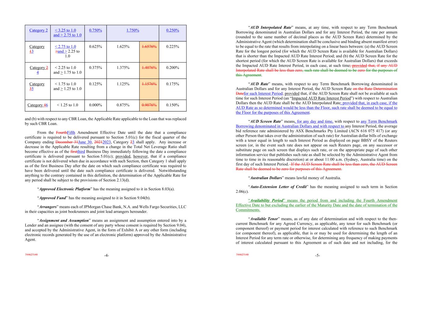 744627140 -4- Category 2 < 3.25 to 1.0 and > 2.75 to 1.0 0.750% 1.750% 0.250% Category 13 < 2.75 to 1.0 ≥and > 2.25 to 1.0 0.625% 1.625% 1.6576% 0.225% Category 2 4 < 2.25 to 1.0 and > 1.75 to 1.0 0.375% 1.375% 1.4076% 0.200% Category 35 < 1.75 to 1.0 and > 1.25 to 1.0 0.125% 1.125% 1.1576% 0.175% Category 46 < 1.25 to 1.0 0.000% 0.875% 0.9076% 0.150% and (b) with respect to any CBR Loan, the Applicable Rate applicable to the Loan that was replaced by such CBR Loan. From the FourthFifth Amendment Effective Date until the date that a compliance certificate is required to be delivered pursuant to Section 5.01(c) for the fiscal quarter of the Company ending December 31June 30, 20212023, Category 23 shall apply. Any increase or decrease in the Applicable Rate resulting from a change in the Total Net Leverage Ratio shall become effective as of the firstthird Business Day immediately following the date a compliance certificate is delivered pursuant to Section 5.01(c); provided, however, that if a compliance certificate is not delivered when due in accordance with such Section, then Category 1 shall apply as of the first Business Day after the date on which such compliance certificate was required to have been delivered until the date such compliance certificate is delivered. Notwithstanding anything to the contrary contained in this definition, the determination of the Applicable Rate for any period shall be subject to the provisions of Section 2.13(d). “Approved Electronic Platform” has the meaning assigned to it in Section 8.03(a). “Approved Fund” has the meaning assigned to it in Section 9.04(b). “Arrangers” means each of JPMorgan Chase Bank, N.A. and Wells Fargo Securities, LLC in their capacities as joint bookrunners and joint lead arrangers hereunder. “Assignment and Assumption” means an assignment and assumption entered into by a Lender and an assignee (with the consent of any party whose consent is required by Section 9.04), and accepted by the Administrative Agent, in the form of Exhibit A or any other form (including electronic records generated by the use of an electronic platform) approved by the Administrative Agent. 744627140 -5- “AUD Interpolated Rate” means, at any time, with respect to any Term Benchmark Borrowing denominated in Australian Dollars and for any Interest Period, the rate per annum (rounded to the same number of decimal places as the AUD Screen Rate) determined by the Administrative Agent (which determination shall be conclusive and binding absent manifest error) to be equal to the rate that results from interpolating on a linear basis between: (a) the AUD Screen Rate for the longest period (for which the AUD Screen Rate is available for Australian Dollars) that is shorter than the Impacted AUD Rate Interest Period; and (b) the AUD Screen Rate for the shortest period (for which the AUD Screen Rate is available for Australian Dollars) that exceeds the Impacted AUD Rate Interest Period, in each case, at such time; provided that, if any AUD Interpolated Rate shall be less than zero, such rate shall be deemed to be zero for the purposes of this Agreement. “AUD Rate” means, with respect to any Term Benchmark Borrowing denominated in Australian Dollars and for any Interest Period, the AUD Screen Rate on the Rate Determination Datefor such Interest Period; provided that, if the AUD Screen Rate shall not be available at such time for such Interest Period (an “Impacted AUD Rate Interest Period”) with respect to Australian Dollars then the AUD Rate shall be the AUD Interpolated Rate; provided that, in each case, if the AUD Rate as so determined would be less than the Floor, such rate shall be deemed to be equal to the Floor for the purposes of this Agreement. “AUD Screen Rate” means, for any day and time, with respect to any Term Benchmark Borrowing denominated in Australian Dollars and with respect to any Interest Period, the average bid reference rate administered by ASX Benchmarks Pty Limited (ACN 616 075 417) (or any other Person that takes over the administration of such rate) for Australian dollar bills of exchange with a tenor equal in length to such Interest Period as displayed on page BBSY of the Reuters screen (or, in the event such rate does not appear on such Reuters page, on any successor or substitute page on such screen that displays such rate, or on the appropriate page of such other information service that publishes such rate as shall be selected by the Administrative Agent from time to time in its reasonable discretion) at or about 11:00 a.m. (Sydney, Australia time) on the first day of such Interest Period. If the AUD Screen Rate shall be less than zero, the AUD Screen Rate shall be deemed to be zero for purposes of this Agreement. “Australian Dollars” means lawful money of Australia. “Auto-Extension Letter of Credit” has the meaning assigned to such term in Section 2.06(c). “Availability Period” means the period from and including the Fourth Amendment Effective Date to but excluding the earlier of the Maturity Date and the date of termination of the Commitments. “Available Tenor” means, as of any date of determination and with respect to the then- current Benchmark for any Agreed Currency, as applicable, any tenor for such Benchmark (or component thereof) or payment period for interest calculated with reference to such Benchmark (or component thereof), as applicable, that is or may be used for determining the length of an Interest Period for any term rate or otherwise, for determining any frequency of making payments of interest calculated pursuant to this Agreement as of such date and not including, for the