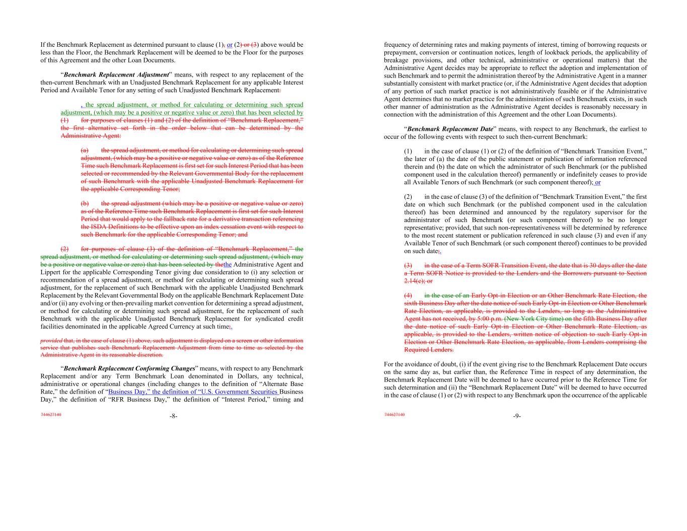744627140 -8- If the Benchmark Replacement as determined pursuant to clause (1), or (2) or (3) above would be less than the Floor, the Benchmark Replacement will be deemed to be the Floor for the purposes of this Agreement and the other Loan Documents. “Benchmark Replacement Adjustment” means, with respect to any replacement of the then-current Benchmark with an Unadjusted Benchmark Replacement for any applicable Interest Period and Available Tenor for any setting of such Unadjusted Benchmark Replacement: , the spread adjustment, or method for calculating or determining such spread adjustment, (which may be a positive or negative value or zero) that has been selected by (1) for purposes of clauses (1) and (2) of the definition of “Benchmark Replacement,” the first alternative set forth in the order below that can be determined by the Administrative Agent: (a) the spread adjustment, or method for calculating or determining such spread adjustment, (which may be a positive or negative value or zero) as of the Reference Time such Benchmark Replacement is first set for such Interest Period that has been selected or recommended by the Relevant Governmental Body for the replacement of such Benchmark with the applicable Unadjusted Benchmark Replacement for the applicable Corresponding Tenor; (b) the spread adjustment (which may be a positive or negative value or zero) as of the Reference Time such Benchmark Replacement is first set for such Interest Period that would apply to the fallback rate for a derivative transaction referencing the ISDA Definitions to be effective upon an index cessation event with respect to such Benchmark for the applicable Corresponding Tenor; and (2) for purposes of clause (3) of the definition of “Benchmark Replacement,” the spread adjustment, or method for calculating or determining such spread adjustment, (which may be a positive or negative value or zero) that has been selected by thethe Administrative Agent and Lippert for the applicable Corresponding Tenor giving due consideration to (i) any selection or recommendation of a spread adjustment, or method for calculating or determining such spread adjustment, for the replacement of such Benchmark with the applicable Unadjusted Benchmark Replacement by the Relevant Governmental Body on the applicable Benchmark Replacement Date and/or (ii) any evolving or then-prevailing market convention for determining a spread adjustment, or method for calculating or determining such spread adjustment, for the replacement of such Benchmark with the applicable Unadjusted Benchmark Replacement for syndicated credit facilities denominated in the applicable Agreed Currency at such time;. provided that, in the case of clause (1) above, such adjustment is displayed on a screen or other information service that publishes such Benchmark Replacement Adjustment from time to time as selected by the Administrative Agent in its reasonable discretion. “Benchmark Replacement Conforming Changes” means, with respect to any Benchmark Replacement and/or any Term Benchmark Loan denominated in Dollars, any technical, administrative or operational changes (including changes to the definition of “Alternate Base Rate,” the definition of “Business Day,” the definition of “U.S. Government Securities Business Day,” the definition of “RFR Business Day,” the definition of “Interest Period,” timing and 744627140 -9- frequency of determining rates and making payments of interest, timing of borrowing requests or prepayment, conversion or continuation notices, length of lookback periods, the applicability of breakage provisions, and other technical, administrative or operational matters) that the Administrative Agent decides may be appropriate to reflect the adoption and implementation of such Benchmark and to permit the administration thereof by the Administrative Agent in a manner substantially consistent with market practice (or, if the Administrative Agent decides that adoption of any portion of such market practice is not administratively feasible or if the Administrative Agent determines that no market practice for the administration of such Benchmark exists, in such other manner of administration as the Administrative Agent decides is reasonably necessary in connection with the administration of this Agreement and the other Loan Documents). “Benchmark Replacement Date” means, with respect to any Benchmark, the earliest to occur of the following events with respect to such then-current Benchmark: (1) in the case of clause (1) or (2) of the definition of “Benchmark Transition Event,” the later of (a) the date of the public statement or publication of information referenced therein and (b) the date on which the administrator of such Benchmark (or the published component used in the calculation thereof) permanently or indefinitely ceases to provide all Available Tenors of such Benchmark (or such component thereof); or (2) in the case of clause (3) of the definition of “Benchmark Transition Event,” the first date on which such Benchmark (or the published component used in the calculation thereof) has been determined and announced by the regulatory supervisor for the administrator of such Benchmark (or such component thereof) to be no longer representative; provided, that such non-representativeness will be determined by reference to the most recent statement or publication referenced in such clause (3) and even if any Available Tenor of such Benchmark (or such component thereof) continues to be provided on such date;. (3) in the case of a Term SOFR Transition Event, the date that is 30 days after the date a Term SOFR Notice is provided to the Lenders and the Borrowers pursuant to Section 2.14(c); or (4) in the case of an Early Opt-in Election or an Other Benchmark Rate Election, the sixth Business Day after the date notice of such Early Opt-in Election or Other Benchmark Rate Election, as applicable, is provided to