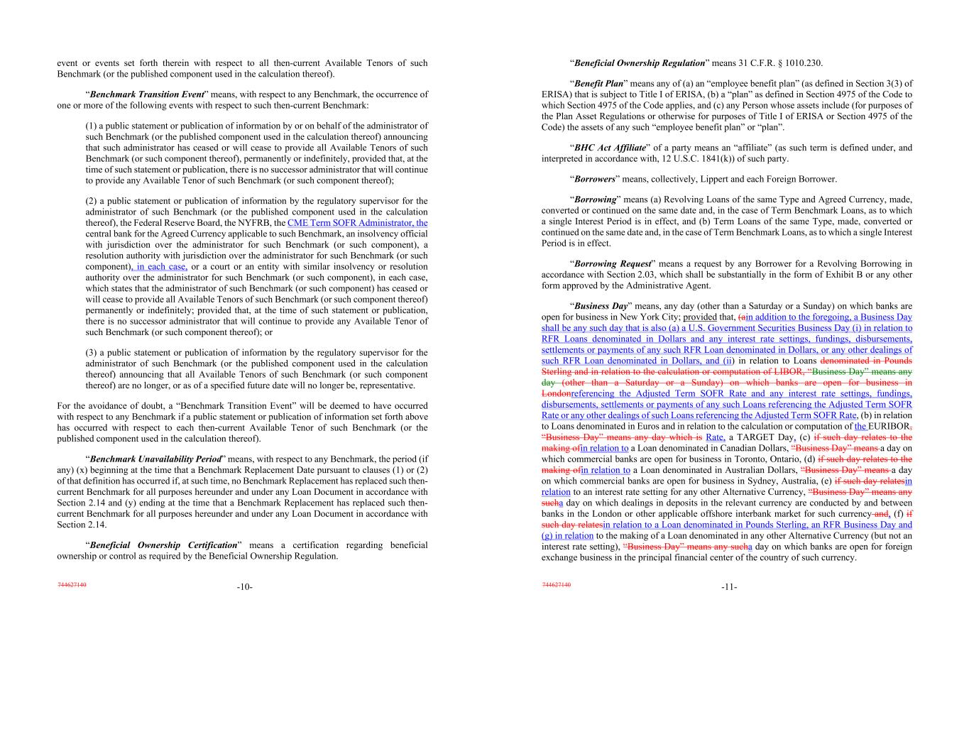 744627140 -10- event or events set forth therein with respect to all then-current Available Tenors of such Benchmark (or the published component used in the calculation thereof). “Benchmark Transition Event” means, with respect to any Benchmark, the occurrence of one or more of the following events with respect to such then-current Benchmark: (1) a public statement or publication of information by or on behalf of the administrator of such Benchmark (or the published component used in the calculation thereof) announcing that such administrator has ceased or will cease to provide all Available Tenors of such Benchmark (or such component thereof), permanently or indefinitely, provided that, at the time of such statement or publication, there is no successor administrator that will continue to provide any Available Tenor of such Benchmark (or such component thereof); (2) a public statement or publication of information by the regulatory supervisor for the administrator of such Benchmark (or the published component used in the calculation thereof), the Federal Reserve Board, the NYFRB, the CME Term SOFR Administrator, the central bank for the Agreed Currency applicable to such Benchmark, an insolvency official with jurisdiction over the administrator for such Benchmark (or such component), a resolution authority with jurisdiction over the administrator for such Benchmark (or such component), in each case, or a court or an entity with similar insolvency or resolution authority over the administrator for such Benchmark (or such component), in each case, which states that the administrator of such Benchmark (or such component) has ceased or will cease to provide all Available Tenors of such Benchmark (or such component thereof) permanently or indefinitely; provided that, at the time of such statement or publication, there is no successor administrator that will continue to provide any Available Tenor of such Benchmark (or such component thereof); or (3) a public statement or publication of information by the regulatory supervisor for the administrator of such Benchmark (or the published component used in the calculation thereof) announcing that all Available Tenors of such Benchmark (or such component thereof) are no longer, or as of a specified future date will no longer be, representative. For the avoidance of doubt, a “Benchmark Transition Event” will be deemed to have occurred with respect to any Benchmark if a public statement or publication of information set forth above has occurred with respect to each then-current Available Tenor of such Benchmark (or the published component used in the calculation thereof). “Benchmark Unavailability Period” means, with respect to any Benchmark, the period (if any) (x) beginning at the time that a Benchmark Replacement Date pursuant to clauses (1) or (2) of that definition has occurred if, at such time, no Benchmark Replacement has replaced such then- current Benchmark for all purposes hereunder and under any Loan Document in accordance with Section 2.14 and (y) ending at the time that a Benchmark Replacement has replaced such then- current Benchmark for all purposes hereunder and under any Loan Document in accordance with Section 2.14. “Beneficial Ownership Certification” means a certification regarding beneficial ownership or control as required by the Beneficial Ownership Regulation. 744627140 -11- “Beneficial Ownership Regulation” means 31 C.F.R. § 1010.230. “Benefit Plan” means any of (a) an “employee benefit plan” (as defined in Section 3(3) of ERISA) that is subject to Title I of ERISA, (b) a “plan” as defined in Section 4975 of the Code to which Section 4975 of the Code applies, and (c) any Person whose assets include (for purposes of the Plan Asset Regulations or otherwise for purposes of Title I of ERISA or Section 4975 of the Code) the assets of any such “employee benefit plan” or “plan”. “BHC Act Affiliate” of a party means an “affiliate” (as such term is defined under, and interpreted in accordance with, 12 U.S.C. 1841(k)) of such party. “Borrowers” means, collectively, Lippert and each Foreign Borrower. “Borrowing” means (a) Revolving Loans of the same Type and Agreed Currency, made, converted or continued on the same date and, in the case of Term Benchmark Loans, as to which a single Interest Period is in effect, and (b) Term Loans of the same Type, made, converted or continued on the same date and, in the case of Term Benchmark Loans, as to which a single Interest Period is in effect. “Borrowing Request” means a request by any Borrower for a Revolving Borrowing in accordance with Section 2.03, which shall be substantially in the form of Exhibit B or any other form approved by the Administrative Agent. “Business Day” means, any day (other than a Saturday or a Sunday) on which banks are open for business in New York City; provided that, (ain addition to the foregoing, a Business Day shall be any such day that is also (a) a U.S. Government Securities Business Day (i) in relation to RFR Loans denominated in Dollars and any interest rate settings, fundings, disbursements, settlements or payments of any such RFR Loan denominated in Dollars, or any other dealings of such RFR Loan denominated in Dollars, and (ii) in relation to Loans denominated in Pounds Sterling and in relation to the calculation or computation of LIBOR, “Business Day” means any day (other than a Saturday or a Sunday) on which banks are open for business in Londonreferencing the Adjusted Term SOFR Rate and any interest rate settings, fundings, disbursements, settlements or payments of any such Loans referencing the Adjusted Term SOFR Rate or any other dealings of such Loans referencing the Adjusted Term SOFR Rate, (b) in relation to Loans denominated in Euros and in relation to the calculation or computation of the EURIBOR, “Business Day” means any day which is Rate, a TARGET Day, (c) if such day relates 