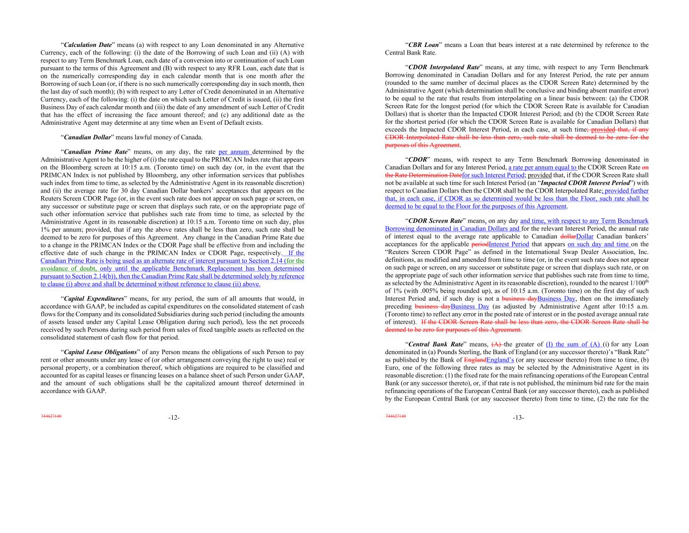 744627140 -12- “Calculation Date” means (a) with respect to any Loan denominated in any Alternative Currency, each of the following: (i) the date of the Borrowing of such Loan and (ii) (A) with respect to any Term Benchmark Loan, each date of a conversion into or continuation of such Loan pursuant to the terms of this Agreement and (B) with respect to any RFR Loan, each date that is on the numerically corresponding day in each calendar month that is one month after the Borrowing of such Loan (or, if there is no such numerically corresponding day in such month, then the last day of such month); (b) with respect to any Letter of Credit denominated in an Alternative Currency, each of the following: (i) the date on which such Letter of Credit is issued, (ii) the first Business Day of each calendar month and (iii) the date of any amendment of such Letter of Credit that has the effect of increasing the face amount thereof; and (c) any additional date as the Administrative Agent may determine at any time when an Event of Default exists. “Canadian Dollar” means lawful money of Canada. “Canadian Prime Rate” means, on any day, the rate per annum determined by the Administrative Agent to be the higher of (i) the rate equal to the PRIMCAN Index rate that appears on the Bloomberg screen at 10:15 a.m. (Toronto time) on such day (or, in the event that the PRIMCAN Index is not published by Bloomberg, any other information services that publishes such index from time to time, as selected by the Administrative Agent in its reasonable discretion) and (ii) the average rate for 30 day Canadian Dollar bankers’ acceptances that appears on the Reuters Screen CDOR Page (or, in the event such rate does not appear on such page or screen, on any successor or substitute page or screen that displays such rate, or on the appropriate page of such other information service that publishes such rate from time to time, as selected by the Administrative Agent in its reasonable discretion) at 10:15 a.m. Toronto time on such day, plus 1% per annum; provided, that if any the above rates shall be less than zero, such rate shall be deemed to be zero for purposes of this Agreement. Any change in the Canadian Prime Rate due to a change in the PRIMCAN Index or the CDOR Page shall be effective from and including the effective date of such change in the PRIMCAN Index or CDOR Page, respectively. If the Canadian Prime Rate is being used as an alternate rate of interest pursuant to Section 2.14 (for the avoidance of doubt, only until the applicable Benchmark Replacement has been determined pursuant to Section 2.14(b)), then the Canadian Prime Rate shall be determined solely by reference to clause (i) above and shall be determined without reference to clause (ii) above. “Capital Expenditures” means, for any period, the sum of all amounts that would, in accordance with GAAP, be included as capital expenditures on the consolidated statement of cash flows for the Company and its consolidated Subsidiaries during such period (including the amounts of assets leased under any Capital Lease Obligation during such period), less the net proceeds received by such Persons during such period from sales of fixed tangible assets as reflected on the consolidated statement of cash flow for that period. “Capital Lease Obligations” of any Person means the obligations of such Person to pay rent or other amounts under any lease of (or other arrangement conveying the right to use) real or personal property, or a combination thereof, which obligations are required to be classified and accounted for as capital leases or financing leases on a balance sheet of such Person under GAAP, and the amount of such obligations shall be the capitalized amount thereof determined in accordance with GAAP. 744627140 -13- “CBR Loan” means a Loan that bears interest at a rate determined by reference to the Central Bank Rate. “CDOR Interpolated Rate” means, at any time, with respect to any Term Benchmark Borrowing denominated in Canadian Dollars and for any Interest Period, the rate per annum (rounded to the same number of decimal places as the CDOR Screen Rate) determined by the Administrative Agent (which determination shall be conclusive and binding absent manifest error) to be equal to the rate that results from interpolating on a linear basis between: (a) the CDOR Screen Rate for the longest period (for which the CDOR Screen Rate is available for Canadian Dollars) that is shorter than the Impacted CDOR Interest Period; and (b) the CDOR Screen Rate for the shortest period (for which the CDOR Screen Rate is available for Canadian Dollars) that exceeds the Impacted CDOR Interest Period, in each case, at such time; provided that, if any CDOR Interpolated Rate shall be less than zero, such rate shall be deemed to be zero for the purposes of this Agreement. “CDOR” means, with respect to any Term Benchmark Borrowing denominated in Canadian Dollars and for any Interest Period, a rate per annum equal to the CDOR Screen Rate on the Rate Determination Datefor such Interest Period; provided that, if the CDOR Screen Rate shall not be available at such time for such Interest Period (an “Impacted CDOR Interest Period”) with respect to Canadian Dollars then the CDOR shall be the CDOR Interpolated Rate; provided further that, in each case, if CDOR as so determined would be less than the Floor, such rate shall be deemed to be equal to the Floor for the purposes of this Agreement. “CDOR Screen Rate” means, on any day and time, with respect to any Term Benchmark Borrowing denominated in Canadian Dollars and for the relevant Interest Period, the annual rate of interest equal to the average rate applicable to Canadian dollarDollar Canadian bankers’ acceptances for the applicable periodInterest Period that appears on such day and time on the “Reuters Screen CDOR Page” as defined in the International Swap Dealer Association, Inc. definitions, as modif