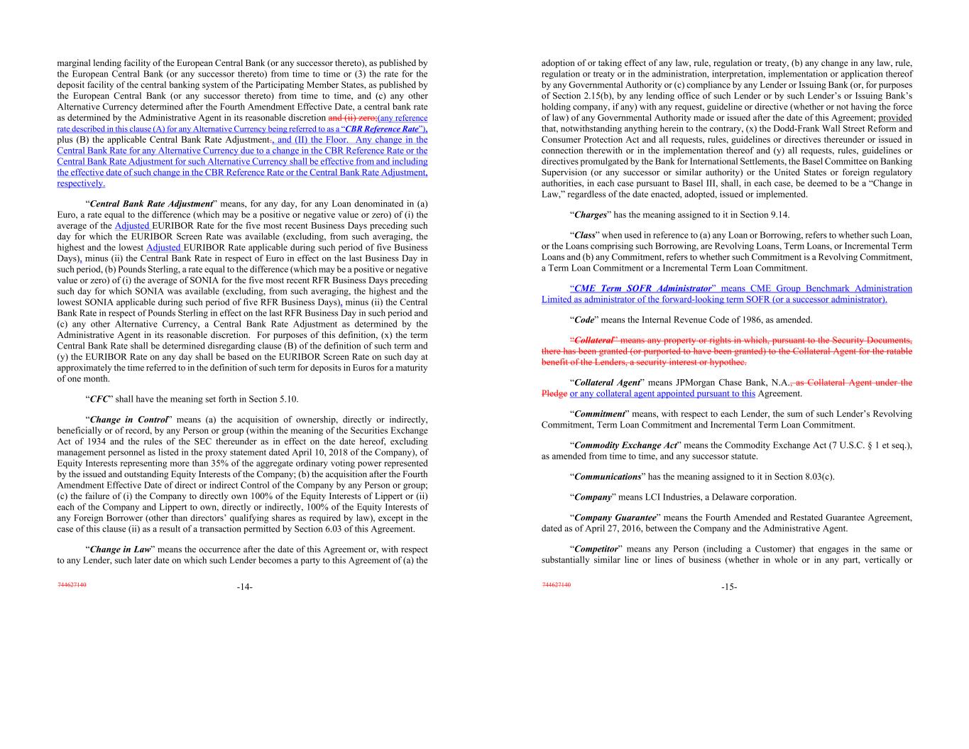 744627140 -14- marginal lending facility of the European Central Bank (or any successor thereto), as published by the European Central Bank (or any successor thereto) from time to time or (3) the rate for the deposit facility of the central banking system of the Participating Member States, as published by the European Central Bank (or any successor thereto) from time to time, and (c) any other Alternative Currency determined after the Fourth Amendment Effective Date, a central bank rate as determined by the Administrative Agent in its reasonable discretion and (ii) zero;(any reference rate described in this clause (A) for any Alternative Currency being referred to as a “CBR Reference Rate”), plus (B) the applicable Central Bank Rate Adjustment., and (II) the Floor. Any change in the Central Bank Rate for any Alternative Currency due to a change in the CBR Reference Rate or the Central Bank Rate Adjustment for such Alternative Currency shall be effective from and including the effective date of such change in the CBR Reference Rate or the Central Bank Rate Adjustment, respectively. “Central Bank Rate Adjustment” means, for any day, for any Loan denominated in (a) Euro, a rate equal to the difference (which may be a positive or negative value or zero) of (i) the average of the Adjusted EURIBOR Rate for the five most recent Business Days preceding such day for which the EURIBOR Screen Rate was available (excluding, from such averaging, the highest and the lowest Adjusted EURIBOR Rate applicable during such period of five Business Days), minus (ii) the Central Bank Rate in respect of Euro in effect on the last Business Day in such period, (b) Pounds Sterling, a rate equal to the difference (which may be a positive or negative value or zero) of (i) the average of SONIA for the five most recent RFR Business Days preceding such day for which SONIA was available (excluding, from such averaging, the highest and the lowest SONIA applicable during such period of five RFR Business Days), minus (ii) the Central Bank Rate in respect of Pounds Sterling in effect on the last RFR Business Day in such period and (c) any other Alternative Currency, a Central Bank Rate Adjustment as determined by the Administrative Agent in its reasonable discretion. For purposes of this definition, (x) the term Central Bank Rate shall be determined disregarding clause (B) of the definition of such term and (y) the EURIBOR Rate on any day shall be based on the EURIBOR Screen Rate on such day at approximately the time referred to in the definition of such term for deposits in Euros for a maturity of one month. “CFC” shall have the meaning set forth in Section 5.10. “Change in Control” means (a) the acquisition of ownership, directly or indirectly, beneficially or of record, by any Person or group (within the meaning of the Securities Exchange Act of 1934 and the rules of the SEC thereunder as in effect on the date hereof, excluding management personnel as listed in the proxy statement dated April 10, 2018 of the Company), of Equity Interests representing more than 35% of the aggregate ordinary voting power represented by the issued and outstanding Equity Interests of the Company; (b) the acquisition after the Fourth Amendment Effective Date of direct or indirect Control of the Company by any Person or group; (c) the failure of (i) the Company to directly own 100% of the Equity Interests of Lippert or (ii) each of the Company and Lippert to own, directly or indirectly, 100% of the Equity Interests of any Foreign Borrower (other than directors’ qualifying shares as required by law), except in the case of this clause (ii) as a result of a transaction permitted by Section 6.03 of this Agreement. “Change in Law” means the occurrence after the date of this Agreement or, with respect to any Lender, such later date on which such Lender becomes a party to this Agreement of (a) the 744627140 -15- adoption of or taking effect of any law, rule, regulation or treaty, (b) any change in any law, rule, regulation or treaty or in the administration, interpretation, implementation or application thereof by any Governmental Authority or (c) compliance by any Lender or Issuing Bank (or, for purposes of Section 2.15(b), by any lending office of such Lender or by such Lender’s or Issuing Bank’s holding company, if any) with any request, guideline or directive (whether or not having the force of law) of any Governmental Authority made or issued after the date of this Agreement; provided that, notwithstanding anything herein to the contrary, (x) the Dodd-Frank Wall Street Reform and Consumer Protection Act and all requests, rules, guidelines or directives thereunder or issued in connection therewith or in the implementation thereof and (y) all requests, rules, guidelines or directives promulgated by the Bank for International Settlements, the Basel Committee on Banking Supervision (or any successor or similar authority) or the United States or foreign regulatory authorities, in each case pursuant to Basel III, shall, in each case, be deemed to be a “Change in Law,” regardless of the date enacted, adopted, issued or implemented. “Charges” has the meaning assigned to it in Section 9.14. “Class” when used in reference to (a) any Loan or Borrowing, refers to whether such Loan, or the Loans comprising such Borrowing, are Revolving Loans, Term Loans, or Incremental Term Loans and (b) any Commitment, refers to whether such Commitment is a Revolving Commitment, a Term Loan Commitment or a Incremental Term Loan Commitment. “CME Term SOFR Administrator” means CME Group Benchmark Administration Limited as administrator of the forward-looking term SOFR (or a successor administrator). “Code” means the Internal Revenue Code of 1986, as amended. “Collateral” means any property or rights in which, pursuant to the Security Documents, there has been granted (or purported to have been granted) to the Collateral Agent