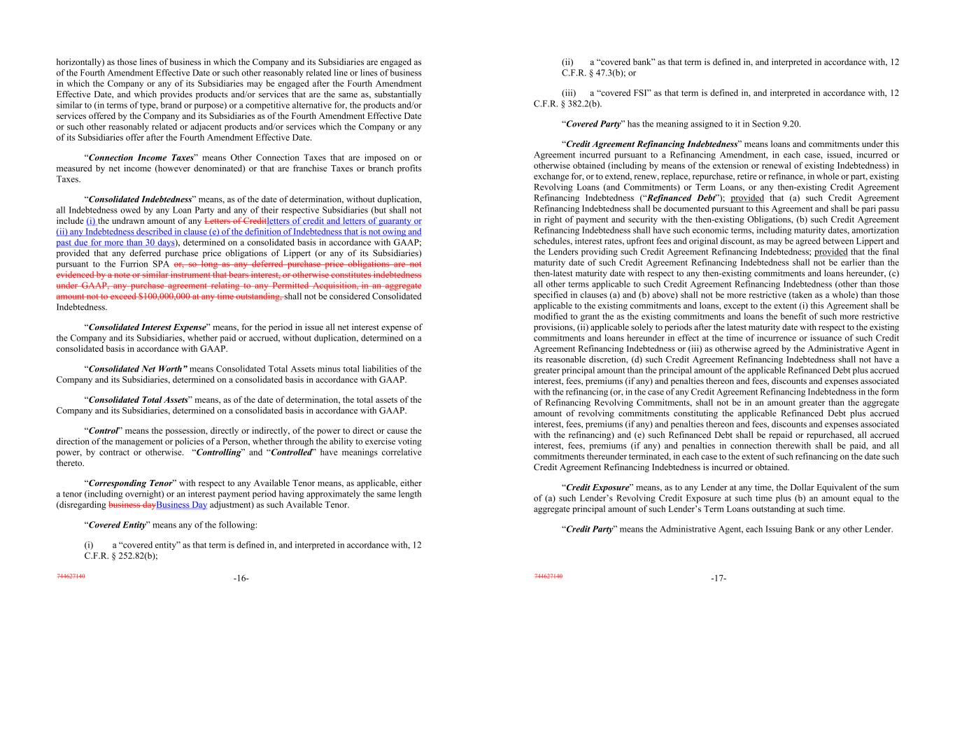 744627140 -16- horizontally) as those lines of business in which the Company and its Subsidiaries are engaged as of the Fourth Amendment Effective Date or such other reasonably related line or lines of business in which the Company or any of its Subsidiaries may be engaged after the Fourth Amendment Effective Date, and which provides products and/or services that are the same as, substantially similar to (in terms of type, brand or purpose) or a competitive alternative for, the products and/or services offered by the Company and its Subsidiaries as of the Fourth Amendment Effective Date or such other reasonably related or adjacent products and/or services which the Company or any of its Subsidiaries offer after the Fourth Amendment Effective Date. “Connection Income Taxes” means Other Connection Taxes that are imposed on or measured by net income (however denominated) or that are franchise Taxes or branch profits Taxes. “Consolidated Indebtedness” means, as of the date of determination, without duplication, all Indebtedness owed by any Loan Party and any of their respective Subsidiaries (but shall not include (i) the undrawn amount of any Letters of Creditletters of credit and letters of guaranty or (ii) any Indebtedness described in clause (e) of the definition of Indebtedness that is not owing and past due for more than 30 days), determined on a consolidated basis in accordance with GAAP; provided that any deferred purchase price obligations of Lippert (or any of its Subsidiaries) pursuant to the Furrion SPA or, so long as any deferred purchase price obligations are not evidenced by a note or similar instrument that bears interest, or otherwise constitutes indebtedness under GAAP, any purchase agreement relating to any Permitted Acquisition, in an aggregate amount not to exceed $100,000,000 at any time outstanding, shall not be considered Consolidated Indebtedness. “Consolidated Interest Expense” means, for the period in issue all net interest expense of the Company and its Subsidiaries, whether paid or accrued, without duplication, determined on a consolidated basis in accordance with GAAP. “Consolidated Net Worth” means Consolidated Total Assets minus total liabilities of the Company and its Subsidiaries, determined on a consolidated basis in accordance with GAAP. “Consolidated Total Assets” means, as of the date of determination, the total assets of the Company and its Subsidiaries, determined on a consolidated basis in accordance with GAAP. “Control” means the possession, directly or indirectly, of the power to direct or cause the direction of the management or policies of a Person, whether through the ability to exercise voting power, by contract or otherwise. “Controlling” and “Controlled” have meanings correlative thereto. “Corresponding Tenor” with respect to any Available Tenor means, as applicable, either a tenor (including overnight) or an interest payment period having approximately the same length (disregarding business dayBusiness Day adjustment) as such Available Tenor. “Covered Entity” means any of the following: (i) a “covered entity” as that term is defined in, and interpreted in accordance with, 12 C.F.R. § 252.82(b); 744627140 -17- (ii) a “covered bank” as that term is defined in, and interpreted in accordance with, 12 C.F.R. § 47.3(b); or (iii) a “covered FSI” as that term is defined in, and interpreted in accordance with, 12 C.F.R. § 382.2(b). “Covered Party” has the meaning assigned to it in Section 9.20. “Credit Agreement Refinancing Indebtedness” means loans and commitments under this Agreement incurred pursuant to a Refinancing Amendment, in each case, issued, incurred or otherwise obtained (including by means of the extension or renewal of existing Indebtedness) in exchange for, or to extend, renew, replace, repurchase, retire or refinance, in whole or part, existing Revolving Loans (and Commitments) or Term Loans, or any then-existing Credit Agreement Refinancing Indebtedness (“Refinanced Debt”); provided that (a) such Credit Agreement Refinancing Indebtedness shall be documented pursuant to this Agreement and shall be pari passu in right of payment and security with the then-existing Obligations, (b) such Credit Agreement Refinancing Indebtedness shall have such economic terms, including maturity dates, amortization schedules, interest rates, upfront fees and original discount, as may be agreed between Lippert and the Lenders providing such Credit Agreement Refinancing Indebtedness; provided that the final maturity date of such Credit Agreement Refinancing Indebtedness shall not be earlier than the then-latest maturity date with respect to any then-existing commitments and loans hereunder, (c) all other terms applicable to such Credit Agreement Refinancing Indebtedness (other than those specified in clauses (a) and (b) above) shall not be more restrictive (taken as a whole) than those applicable to the existing commitments and loans, except to the extent (i) this Agreement shall be modified to grant the as the existing commitments and loans the benefit of such more restrictive provisions, (ii) applicable solely to periods after the latest maturity date with respect to the existing commitments and loans hereunder in effect at the time of incurrence or issuance of such Credit Agreement Refinancing Indebtedness or (iii) as otherwise agreed by the Administrative Agent in its reasonable discretion, (d) such Credit Agreement Refinancing Indebtedness shall not have a greater principal amount than the principal amount of the applicable Refinanced Debt plus accrued interest, fees, premiums (if any) and penalties thereon and fees, discounts and expenses associated with the refinancing (or, in the case of any Credit Agreement Refinancing Indebtedness in the form of Refinancing Revolving Commitments, shall not be in an amount greater than the aggregate amount of revolving commitments constituting the ap