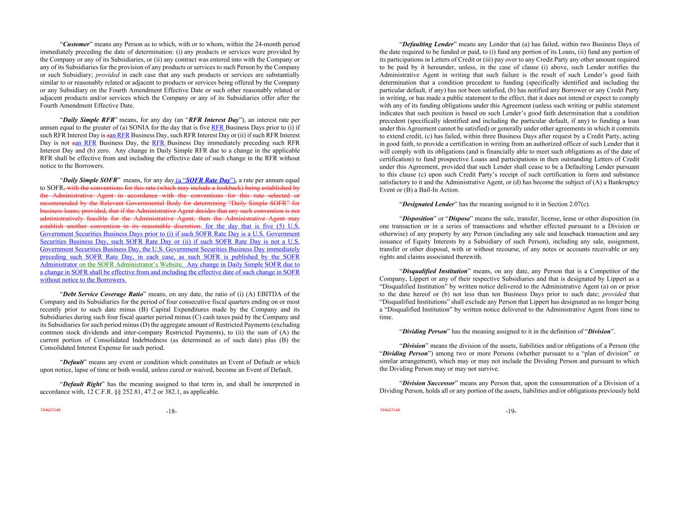 744627140 -18- “Customer” means any Person as to which, with or to whom, within the 24-month period immediately preceding the date of determination: (i) any products or services were provided by the Company or any of its Subsidiaries, or (ii) any contract was entered into with the Company or any of its Subsidiaries for the provision of any products or services to such Person by the Company or such Subsidiary; provided in each case that any such products or services are substantially similar to or reasonably related or adjacent to products or services being offered by the Company or any Subsidiary on the Fourth Amendment Effective Date or such other reasonably related or adjacent products and/or services which the Company or any of its Subsidiaries offer after the Fourth Amendment Effective Date. “Daily Simple RFR” means, for any day (an “RFR Interest Day”), an interest rate per annum equal to the greater of (a) SONIA for the day that is five RFR Business Days prior to (i) if such RFR Interest Day is aan RFR Business Day, such RFR Interest Day or (ii) if such RFR Interest Day is not aan RFR Business Day, the RFR Business Day immediately preceding such RFR Interest Day and (b) zero. Any change in Daily Simple RFR due to a change in the applicable RFR shall be effective from and including the effective date of such change in the RFR without notice to the Borrowers. “Daily Simple SOFR” means, for any day (a “SOFR Rate Day”), a rate per annum equal to SOFR, with the conventions for this rate (which may include a lookback) being established by the Administrative Agent in accordance with the conventions for this rate selected or recommended by the Relevant Governmental Body for determining “Daily Simple SOFR” for business loans; provided, that if the Administrative Agent decides that any such convention is not administratively feasible for the Administrative Agent, then the Administrative Agent may establish another convention in its reasonable discretion. for the day that is five (5) U.S. Government Securities Business Days prior to (i) if such SOFR Rate Day is a U.S. Government Securities Business Day, such SOFR Rate Day or (ii) if such SOFR Rate Day is not a U.S. Government Securities Business Day, the U.S. Government Securities Business Day immediately preceding such SOFR Rate Day, in each case, as such SOFR is published by the SOFR Administrator on the SOFR Administrator’s Website. Any change in Daily Simple SOFR due to a change in SOFR shall be effective from and including the effective date of such change in SOFR without notice to the Borrowers. “Debt Service Coverage Ratio” means, on any date, the ratio of (i) (A) EBITDA of the Company and its Subsidiaries for the period of four consecutive fiscal quarters ending on or most recently prior to such date minus (B) Capital Expenditures made by the Company and its Subsidiaries during such four fiscal quarter period minus (C) cash taxes paid by the Company and its Subsidiaries for such period minus (D) the aggregate amount of Restricted Payments (excluding common stock dividends and inter-company Restricted Payments), to (ii) the sum of (A) the current portion of Consolidated Indebtedness (as determined as of such date) plus (B) the Consolidated Interest Expense for such period. “Default” means any event or condition which constitutes an Event of Default or which upon notice, lapse of time or both would, unless cured or waived, become an Event of Default. “Default Right” has the meaning assigned to that term in, and shall be interpreted in accordance with, 12 C.F.R. §§ 252.81, 47.2 or 382.1, as applicable. 744627140 -19- “Defaulting Lender” means any Lender that (a) has failed, within two Business Days of the date required to be funded or paid, to (i) fund any portion of its Loans, (ii) fund any portion of its participations in Letters of Credit or (iii) pay over to any Credit Party any other amount required to be paid by it hereunder, unless, in the case of clause (i) above, such Lender notifies the Administrative Agent in writing that such failure is the result of such Lender’s good faith determination that a condition precedent to funding (specifically identified and including the particular default, if any) has not been satisfied, (b) has notified any Borrower or any Credit Party in writing, or has made a public statement to the effect, that it does not intend or expect to comply with any of its funding obligations under this Agreement (unless such writing or public statement indicates that such position is based on such Lender’s good faith determination that a condition precedent (specifically identified and including the particular default, if any) to funding a loan under this Agreement cannot be satisfied) or generally under other agreements in which it commits to extend credit, (c) has failed, within three Business Days after request by a Credit Party, acting in good faith, to provide a certification in writing from an authorized officer of such Lender that it will comply with its obligations (and is financially able to meet such obligations as of the date of certification) to fund prospective Loans and participations in then outstanding Letters of Credit under this Agreement, provided that such Lender shall cease to be a Defaulting Lender pursuant to this clause (c) upon such Credit Party’s receipt of such certification in form and substance satisfactory to it and the Administrative Agent, or (d) has become the subject of (A) a Bankruptcy Event or (B) a Bail-In Action. “Designated Lender” has the meaning assigned to it in Section 2.07(c). “Disposition” or “Dispose” means the sale, transfer, license, lease or other disposition (in one transaction or in a series of transactions and whether effected pursuant to a Division or otherwise) of any property by any Person (including any sale and leaseback transaction and any issuance of Equity Interests by a Subsidiary of such Perso