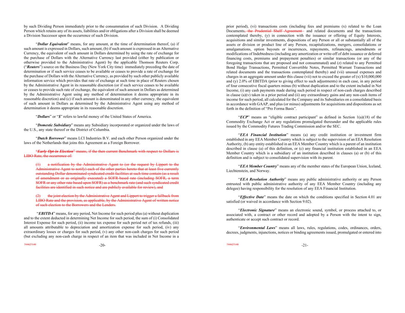 744627140 -20- by such Dividing Person immediately prior to the consummation of such Division. A Dividing Person which retains any of its assets, liabilities and/or obligations after a Division shall be deemed a Division Successor upon the occurrence of such Division. “Dollar Equivalent” means, for any amount, at the time of determination thereof, (a) if such amount is expressed in Dollars, such amount, (b) if such amount is expressed in an Alternative Currency, the equivalent of such amount in Dollars determined by using the rate of exchange for the purchase of Dollars with the Alternative Currency last provided (either by publication or otherwise provided to the Administrative Agent) by the applicable Thomson Reuters Corp. (“Reuters”) source on the Business Day (New York City time) immediately preceding the date of determination or if such service ceases to be available or ceases to provide a rate of exchange for the purchase of Dollars with the Alternative Currency, as provided by such other publicly available information service which provides that rate of exchange at such time in place of Reuters chosen by the Administrative Agent in its reasonable discretion (or if such service ceases to be available or ceases to provide such rate of exchange, the equivalent of such amount in Dollars as determined by the Administrative Agent using any method of determination it deems appropriate in its reasonable discretion) and (c) if such amount is denominated in any other currency, the equivalent of such amount in Dollars as determined by the Administrative Agent using any method of determination it deems appropriate in its reasonable discretion. “Dollars” or “$” refers to lawful money of the United States of America. “Domestic Subsidiary” means any Subsidiary incorporated or organized under the laws of the U.S., any state thereof or the District of Columbia. “Dutch Borrower” means LCI Industries B.V. and each other Person organized under the laws of the Netherlands that joins this Agreement as a Foreign Borrower. “Early Opt-in Election” means, if the then current Benchmark with respect to Dollars is LIBO Rate, the occurrence of: (1) a notification by the Administrative Agent to (or the request by Lippert to the Administrative Agent to notify) each of the other parties hereto that at least five currently outstanding Dollar denominated syndicated credit facilities at such time contain (as a result of amendment or as originally executed) a SOFR-based rate (including SOFR, a term SOFR or any other rate based upon SOFR) as a benchmark rate (and such syndicated credit facilities are identified in such notice and are publicly available for review), and (2) the joint election by the Administrative Agent and Lippert to trigger a fallback from LIBO Rate and the provision, as applicable, by the Administrative Agent of written notice of such election to the Borrowers and the Lenders. “EBITDA” means, for any period, Net Income for such period plus (a) without duplication and to the extent deducted in determining Net Income for such period, the sum of (i) Consolidated Interest Expense for such period, (ii) income tax expense for such period net of tax refunds, (iii) all amounts attributable to depreciation and amortization expense for such period, (iv) any extraordinary losses or charges for such period, (v) any other non-cash charges for such period (but excluding any non-cash charge in respect of an item that was included in Net Income in a 744627140 -21- prior period), (vi) transactions costs (including fees and premiums (x) related to the Loan Documents, the Prudential Shelf Agreement and related documents and the transactions contemplated thereby, (y) in connection with the issuance or offering of Equity Interests, acquisitions and similar investments, dispositions of any Person or all or substantially all of the assets or division or product line of any Person, recapitalizations, mergers, consolidations or amalgamations, option buyouts or incurrences, repayments, refinancings, amendments or modifications of Indebtedness (including any amortization or write-off of debt issuance or deferred financing costs, premiums and prepayment penalties) or similar transactions (or any of the foregoing transactions that are proposed and not consummated) and (z) related to any Permitted Bond Hedge Transactions, Permitted Convertible Notes, Permitted Warrant Transactions and related documents and the transactions contemplated thereby) and (vii) unusual expenses and charges in an aggregate amount under this clause (vii) not to exceed the greater of (x) $10,000,000 and (y) 2.0% of EBITDA (prior to giving effect to such adjustments) in each case, in any period of four consecutive fiscal quarters minus (b) without duplication and to the extent included in Net Income, (i) any cash payments made during such period in respect of non-cash charges described in clause (a)(v) taken in a prior period and (ii) any extraordinary gains and any non-cash items of income for such period, all calculated for the Company and its Subsidiaries on a consolidated basis in accordance with GAAP, and plus (or minus) adjustments for acquisitions and dispositions as set forth in the definition of “Pro Forma Basis”. “ECP” means an “eligible contract participant” as defined in Section 1(a)(18) of the Commodity Exchange Act or any regulations promulgated thereunder and the applicable rules issued by the Commodity Futures Trading Commission and/or the SEC. “EEA Financial Institution” means (a) any credit institution or investment firm established in any EEA Member Country which is subject to the supervision of an EEA Resolution Authority, (b) any entity established in an EEA Member Country which is a parent of an institution described in clause (a) of this definition, or (c) any financial institution established in an EEA Member Country which is a subsidiary of an institution described in clauses (a) or (