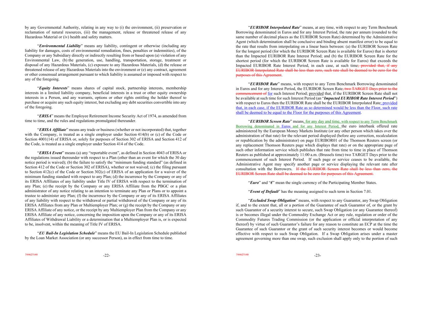 744627140 -22- by any Governmental Authority, relating in any way to (i) the environment, (ii) preservation or reclamation of natural resources, (iii) the management, release or threatened release of any Hazardous Material or (iv) health and safety matters. “Environmental Liability” means any liability, contingent or otherwise (including any liability for damages, costs of environmental remediation, fines, penalties or indemnities), of the Company or any Subsidiary directly or indirectly resulting from or based upon (a) violation of any Environmental Law, (b) the generation, use, handling, transportation, storage, treatment or disposal of any Hazardous Materials, (c) exposure to any Hazardous Materials, (d) the release or threatened release of any Hazardous Materials into the environment or (e) any contract, agreement or other consensual arrangement pursuant to which liability is assumed or imposed with respect to any of the foregoing. “Equity Interests” means shares of capital stock, partnership interests, membership interests in a limited liability company, beneficial interests in a trust or other equity ownership interests in a Person, and any warrants, options or other rights entitling the holder thereof to purchase or acquire any such equity interest, but excluding any debt securities convertible into any of the foregoing. “ERISA” means the Employee Retirement Income Security Act of 1974, as amended from time to time, and the rules and regulations promulgated thereunder. “ERISA Affiliate” means any trade or business (whether or not incorporated) that, together with the Company, is treated as a single employer under Section 414(b) or (c) of the Code or Section 4001(14) of ERISA or, solely for purposes of Section 302 of ERISA and Section 412 of the Code, is treated as a single employer under Section 414 of the Code. “ERISA Event” means (a) any “reportable event”, as defined in Section 4043 of ERISA or the regulations issued thereunder with respect to a Plan (other than an event for which the 30 day notice period is waived); (b) the failure to satisfy the “minimum funding standard” (as defined in Section 412 of the Code or Section 302 of ERISA), whether or not waived; (c) the filing pursuant to Section 412(c) of the Code or Section 302(c) of ERISA of an application for a waiver of the minimum funding standard with respect to any Plan; (d) the incurrence by the Company or any of its ERISA Affiliates of any liability under Title IV of ERISA with respect to the termination of any Plan; (e) the receipt by the Company or any ERISA Affiliate from the PBGC or a plan administrator of any notice relating to an intention to terminate any Plan or Plans or to appoint a trustee to administer any Plan; (f) the incurrence by the Company or any of its ERISA Affiliates of any liability with respect to the withdrawal or partial withdrawal of the Company or any of its ERISA Affiliates from any Plan or Multiemployer Plan; or (g) the receipt by the Company or any ERISA Affiliate of any notice, or the receipt by any Multiemployer Plan from the Company or any ERISA Affiliate of any notice, concerning the imposition upon the Company or any of its ERISA Affiliates of Withdrawal Liability or a determination that a Multiemployer Plan is, or is expected to be, insolvent, within the meaning of Title IV of ERISA. “EU Bail-In Legislation Schedule” means the EU Bail-In Legislation Schedule published by the Loan Market Association (or any successor Person), as in effect from time to time. 744627140 -23- “EURIBOR Interpolated Rate” means, at any time, with respect to any Term Benchmark Borrowing denominated in Euros and for any Interest Period, the rate per annum (rounded to the same number of decimal places as the EURIBOR Screen Rate) determined by the Administrative Agent (which determination shall be conclusive and binding absent manifest error) to be equal to the rate that results from interpolating on a linear basis between: (a) the EURIBOR Screen Rate for the longest period (for which the EURIBOR Screen Rate is available for Euros) that is shorter than the Impacted EURIBOR Rate Interest Period; and (b) the EURIBOR Screen Rate for the shortest period (for which the EURIBOR Screen Rate is available for Euros) that exceeds the Impacted EURIBOR Rate Interest Period, in each case, at such time; provided that, if any EURIBOR Interpolated Rate shall be less than zero, such rate shall be deemed to be zero for the purposes of this Agreement. “EURIBOR Rate” means, with respect to any Term Benchmark Borrowing denominated in Euros and for any Interest Period, the EURIBOR Screen Rate, two TARGET Days prior to the commencement of for such Interest Period; provided that, if the EURIBOR Screen Rate shall not be available at such time for such Interest Period (an “Impacted EURIBOR Rate Interest Period”) with respect to Euros then the EURIBOR Rate shall be the EURIBOR Interpolated Rate; provided that, in each case, if the EURIBOR Rate as so determined would be less than the Floor, such rate shall be deemed to be equal to the Floor for the purposes of this Agreement. “EURIBOR Screen Rate” means, for any day and time, with respect to any Term Benchmark Borrowing denominated in Euros and for any Interest Period, the euro interbank offered rate administered by the European Money Markets Institute (or any other person which takes over the administration of that rate) for the relevant period displayed (before any correction, recalculation or republication by the administrator) on page EURIBOR01 of the Thomson Reuters screen (or any replacement Thomson Reuters page which displays that rate) or on the appropriate page of such other information service which publishes that rate from time to time in place of Thomson Reuters as published at approximately 11:00 a.m. (Brussels time) two TARGET Days prior to the commencement of such Interest Period. If such page or service ceases to be available, 