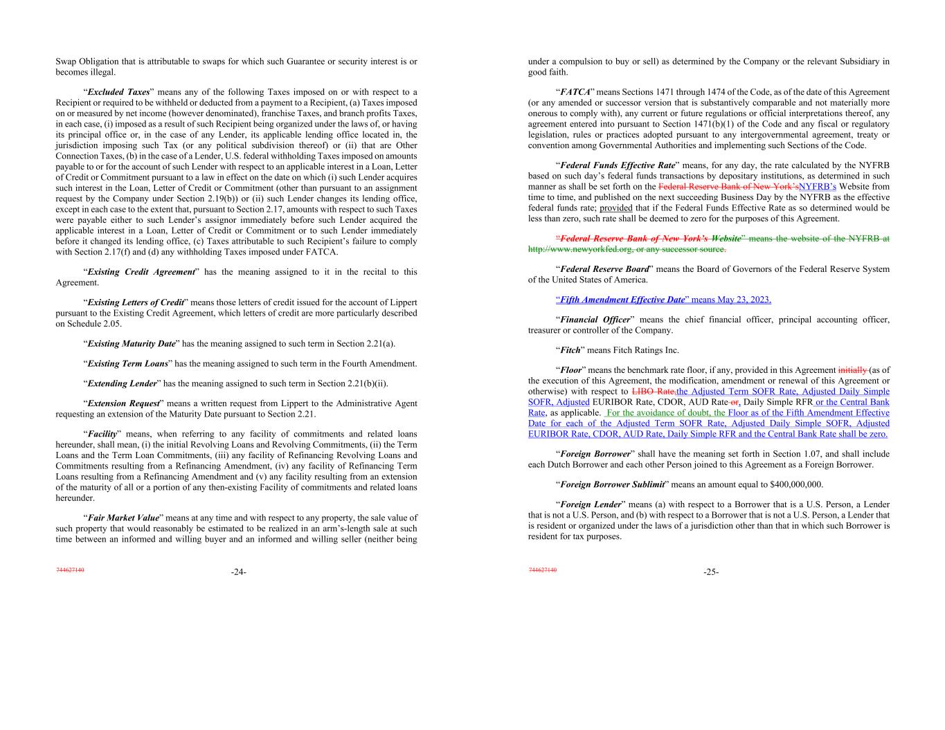 744627140 -24- Swap Obligation that is attributable to swaps for which such Guarantee or security interest is or becomes illegal. “Excluded Taxes” means any of the following Taxes imposed on or with respect to a Recipient or required to be withheld or deducted from a payment to a Recipient, (a) Taxes imposed on or measured by net income (however denominated), franchise Taxes, and branch profits Taxes, in each case, (i) imposed as a result of such Recipient being organized under the laws of, or having its principal office or, in the case of any Lender, its applicable lending office located in, the jurisdiction imposing such Tax (or any political subdivision thereof) or (ii) that are Other Connection Taxes, (b) in the case of a Lender, U.S. federal withholding Taxes imposed on amounts payable to or for the account of such Lender with respect to an applicable interest in a Loan, Letter of Credit or Commitment pursuant to a law in effect on the date on which (i) such Lender acquires such interest in the Loan, Letter of Credit or Commitment (other than pursuant to an assignment request by the Company under Section 2.19(b)) or (ii) such Lender changes its lending office, except in each case to the extent that, pursuant to Section 2.17, amounts with respect to such Taxes were payable either to such Lender’s assignor immediately before such Lender acquired the applicable interest in a Loan, Letter of Credit or Commitment or to such Lender immediately before it changed its lending office, (c) Taxes attributable to such Recipient’s failure to comply with Section 2.17(f) and (d) any withholding Taxes imposed under FATCA. “Existing Credit Agreement” has the meaning assigned to it in the recital to this Agreement. “Existing Letters of Credit” means those letters of credit issued for the account of Lippert pursuant to the Existing Credit Agreement, which letters of credit are more particularly described on Schedule 2.05. “Existing Maturity Date” has the meaning assigned to such term in Section 2.21(a). “Existing Term Loans” has the meaning assigned to such term in the Fourth Amendment. “Extending Lender” has the meaning assigned to such term in Section 2.21(b)(ii). “Extension Request” means a written request from Lippert to the Administrative Agent requesting an extension of the Maturity Date pursuant to Section 2.21. “Facility” means, when referring to any facility of commitments and related loans hereunder, shall mean, (i) the initial Revolving Loans and Revolving Commitments, (ii) the Term Loans and the Term Loan Commitments, (iii) any facility of Refinancing Revolving Loans and Commitments resulting from a Refinancing Amendment, (iv) any facility of Refinancing Term Loans resulting from a Refinancing Amendment and (v) any facility resulting from an extension of the maturity of all or a portion of any then-existing Facility of commitments and related loans hereunder. “Fair Market Value” means at any time and with respect to any property, the sale value of such property that would reasonably be estimated to be realized in an arm’s-length sale at such time between an informed and willing buyer and an informed and willing seller (neither being 744627140 -25- under a compulsion to buy or sell) as determined by the Company or the relevant Subsidiary in good faith. “FATCA” means Sections 1471 through 1474 of the Code, as of the date of this Agreement (or any amended or successor version that is substantively comparable and not materially more onerous to comply with), any current or future regulations or official interpretations thereof, any agreement entered into pursuant to Section 1471(b)(1) of the Code and any fiscal or regulatory legislation, rules or practices adopted pursuant to any intergovernmental agreement, treaty or convention among Governmental Authorities and implementing such Sections of the Code. “Federal Funds Effective Rate” means, for any day, the rate calculated by the NYFRB based on such day’s federal funds transactions by depositary institutions, as determined in such manner as shall be set forth on the Federal Reserve Bank of New York’sNYFRB’s Website from time to time, and published on the next succeeding Business Day by the NYFRB as the effective federal funds rate; provided that if the Federal Funds Effective Rate as so determined would be less than zero, such rate shall be deemed to zero for the purposes of this Agreement. “Federal Reserve Bank of New York’s Website” means the website of the NYFRB at http://www.newyorkfed.org, or any successor source. “Federal Reserve Board” means the Board of Governors of the Federal Reserve System of the United States of America. “Fifth Amendment Effective Date” means May 23, 2023. “Financial Officer” means the chief financial officer, principal accounting officer, treasurer or controller of the Company. “Fitch” means Fitch Ratings Inc. “Floor” means the benchmark rate floor, if any, provided in this Agreement initially (as of the execution of this Agreement, the modification, amendment or renewal of this Agreement or otherwise) with respect to LIBO Rate,the Adjusted Term SOFR Rate, Adjusted Daily Simple SOFR, Adjusted EURIBOR Rate, CDOR, AUD Rate or, Daily Simple RFR or the Central Bank Rate, as applicable. For the avoidance of doubt, the Floor as of the Fifth Amendment Effective Date for each of the Adjusted Term SOFR Rate, Adjusted Daily Simple SOFR, Adjusted EURIBOR Rate, CDOR, AUD Rate, Daily Simple RFR and the Central Bank Rate shall be zero. “Foreign Borrower” shall have the meaning set forth in Section 1.07, and shall include each Dutch Borrower and each other Person joined to this Agreement as a Foreign Borrower. “Foreign Borrower Sublimit” means an amount equal to $400,000,000. “Foreign Lender” means (a) with respect to a Borrower that is a U.S. Person, a Lender that is not a U.S. Person, and (b) with respect to a Borrower that is not a U.S.