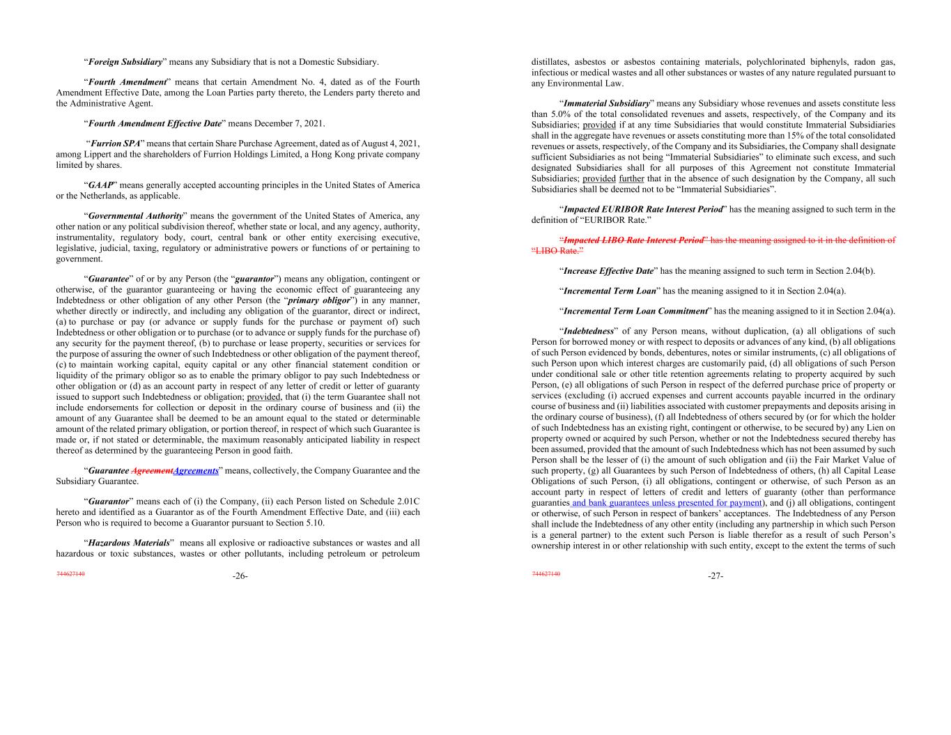 744627140 -26- “Foreign Subsidiary” means any Subsidiary that is not a Domestic Subsidiary. “Fourth Amendment” means that certain Amendment No. 4, dated as of the Fourth Amendment Effective Date, among the Loan Parties party thereto, the Lenders party thereto and the Administrative Agent. “Fourth Amendment Effective Date” means December 7, 2021. “Furrion SPA” means that certain Share Purchase Agreement, dated as of August 4, 2021, among Lippert and the shareholders of Furrion Holdings Limited, a Hong Kong private company limited by shares. “GAAP” means generally accepted accounting principles in the United States of America or the Netherlands, as applicable. “Governmental Authority” means the government of the United States of America, any other nation or any political subdivision thereof, whether state or local, and any agency, authority, instrumentality, regulatory body, court, central bank or other entity exercising executive, legislative, judicial, taxing, regulatory or administrative powers or functions of or pertaining to government. “Guarantee” of or by any Person (the “guarantor”) means any obligation, contingent or otherwise, of the guarantor guaranteeing or having the economic effect of guaranteeing any Indebtedness or other obligation of any other Person (the “primary obligor”) in any manner, whether directly or indirectly, and including any obligation of the guarantor, direct or indirect, (a) to purchase or pay (or advance or supply funds for the purchase or payment of) such Indebtedness or other obligation or to purchase (or to advance or supply funds for the purchase of) any security for the payment thereof, (b) to purchase or lease property, securities or services for the purpose of assuring the owner of such Indebtedness or other obligation of the payment thereof, (c) to maintain working capital, equity capital or any other financial statement condition or liquidity of the primary obligor so as to enable the primary obligor to pay such Indebtedness or other obligation or (d) as an account party in respect of any letter of credit or letter of guaranty issued to support such Indebtedness or obligation; provided, that (i) the term Guarantee shall not include endorsements for collection or deposit in the ordinary course of business and (ii) the amount of any Guarantee shall be deemed to be an amount equal to the stated or determinable amount of the related primary obligation, or portion thereof, in respect of which such Guarantee is made or, if not stated or determinable, the maximum reasonably anticipated liability in respect thereof as determined by the guaranteeing Person in good faith. “Guarantee AgreementAgreements” means, collectively, the Company Guarantee and the Subsidiary Guarantee. “Guarantor” means each of (i) the Company, (ii) each Person listed on Schedule 2.01C hereto and identified as a Guarantor as of the Fourth Amendment Effective Date, and (iii) each Person who is required to become a Guarantor pursuant to Section 5.10. “Hazardous Materials” means all explosive or radioactive substances or wastes and all hazardous or toxic substances, wastes or other pollutants, including petroleum or petroleum 744627140 -27- distillates, asbestos or asbestos containing materials, polychlorinated biphenyls, radon gas, infectious or medical wastes and all other substances or wastes of any nature regulated pursuant to any Environmental Law. “Immaterial Subsidiary” means any Subsidiary whose revenues and assets constitute less than 5.0% of the total consolidated revenues and assets, respectively, of the Company and its Subsidiaries; provided if at any time Subsidiaries that would constitute Immaterial Subsidiaries shall in the aggregate have revenues or assets constituting more than 15% of the total consolidated revenues or assets, respectively, of the Company and its Subsidiaries, the Company shall designate sufficient Subsidiaries as not being “Immaterial Subsidiaries” to eliminate such excess, and such designated Subsidiaries shall for all purposes of this Agreement not constitute Immaterial Subsidiaries; provided further that in the absence of such designation by the Company, all such Subsidiaries shall be deemed not to be “Immaterial Subsidiaries”. “Impacted EURIBOR Rate Interest Period” has the meaning assigned to such term in the definition of “EURIBOR Rate.” “Impacted LIBO Rate Interest Period” has the meaning assigned to it in the definition of “LIBO Rate.” “Increase Effective Date” has the meaning assigned to such term in Section 2.04(b). “Incremental Term Loan” has the meaning assigned to it in Section 2.04(a). “Incremental Term Loan Commitment” has the meaning assigned to it in Section 2.04(a). “Indebtedness” of any Person means, without duplication, (a) all obligations of such Person for borrowed money or with respect to deposits or advances of any kind, (b) all obligations of such Person evidenced by bonds, debentures, notes or similar instruments, (c) all obligations of such Person upon which interest charges are customarily paid, (d) all obligations of such Person under conditional sale or other title retention agreements relating to property acquired by such Person, (e) all obligations of such Person in respect of the deferred purchase price of property or services (excluding (i) accrued expenses and current accounts payable incurred in the ordinary course of business and (ii) liabilities associated with customer prepayments and deposits arising in the ordinary course of business), (f) all Indebtedness of others secured by (or for which the holder of such Indebtedness has an existing right, contingent or otherwise, to be secured by) any Lien on property owned or acquired by such Person, whether or not the Indebtedness secured thereby has been assumed, provided that the amount of such Indebtedness which has not been assumed by such Person shall be the lesser of (i) the a