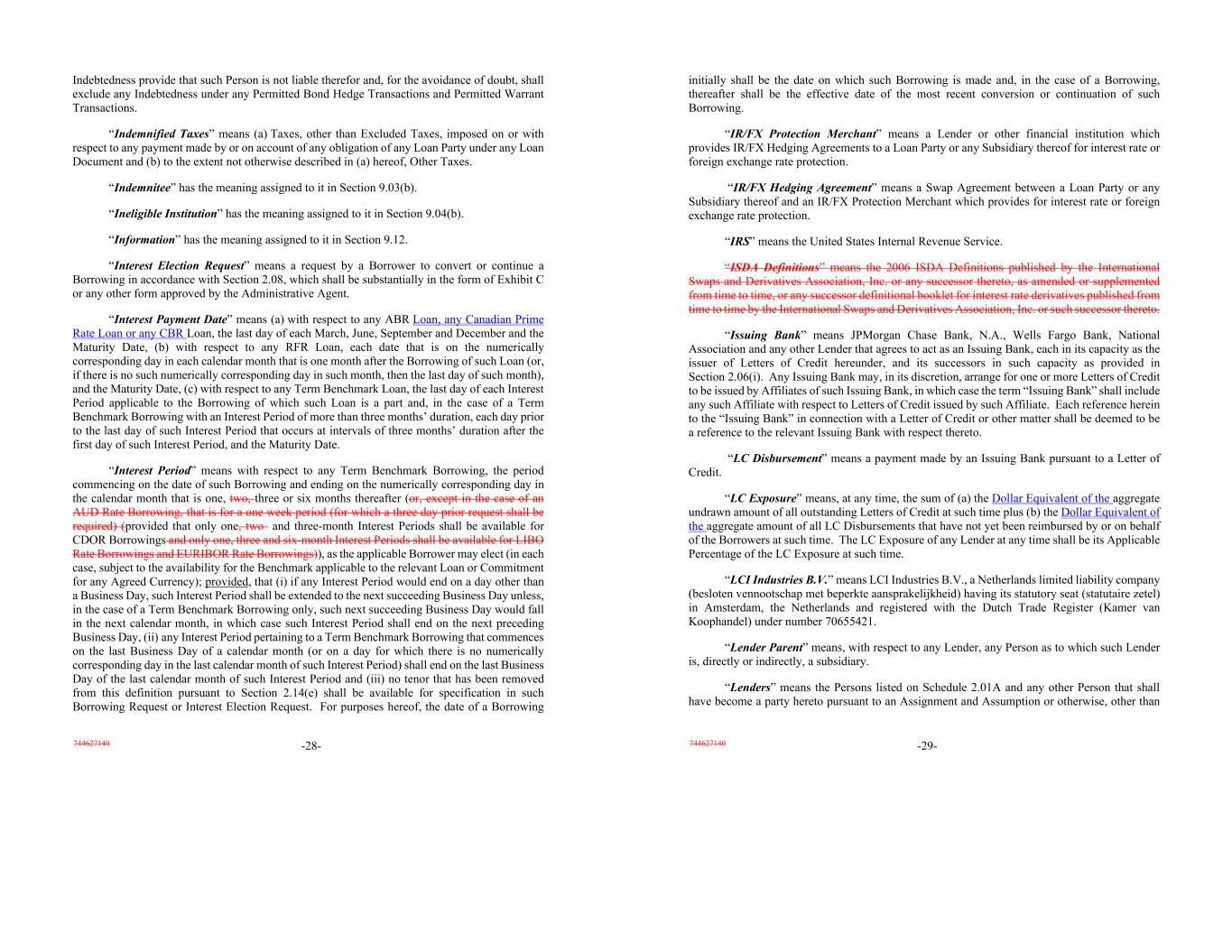 744627140 -28- Indebtedness provide that such Person is not liable therefor and, for the avoidance of doubt, shall exclude any Indebtedness under any Permitted Bond Hedge Transactions and Permitted Warrant Transactions. “Indemnified Taxes” means (a) Taxes, other than Excluded Taxes, imposed on or with respect to any payment made by or on account of any obligation of any Loan Party under any Loan Document and (b) to the extent not otherwise described in (a) hereof, Other Taxes. “Indemnitee” has the meaning assigned to it in Section 9.03(b). “Ineligible Institution” has the meaning assigned to it in Section 9.04(b). “Information” has the meaning assigned to it in Section 9.12. “Interest Election Request” means a request by a Borrower to convert or continue a Borrowing in accordance with Section 2.08, which shall be substantially in the form of Exhibit C or any other form approved by the Administrative Agent. “Interest Payment Date” means (a) with respect to any ABR Loan, any Canadian Prime Rate Loan or any CBR Loan, the last day of each March, June, September and December and the Maturity Date, (b) with respect to any RFR Loan, each date that is on the numerically corresponding day in each calendar month that is one month after the Borrowing of such Loan (or, if there is no such numerically corresponding day in such month, then the last day of such month), and the Maturity Date, (c) with respect to any Term Benchmark Loan, the last day of each Interest Period applicable to the Borrowing of which such Loan is a part and, in the case of a Term Benchmark Borrowing with an Interest Period of more than three months’ duration, each day prior to the last day of such Interest Period that occurs at intervals of three months’ duration after the first day of such Interest Period, and the Maturity Date. “Interest Period” means with respect to any Term Benchmark Borrowing, the period commencing on the date of such Borrowing and ending on the numerically corresponding day in the calendar month that is one, two, three or six months thereafter (or, except in the case of an AUD Rate Borrowing, that is for a one week period (for which a three day prior request shall be required) (provided that only one, two and three-month Interest Periods shall be available for CDOR Borrowings and only one, three and six-month Interest Periods shall be available for LIBO Rate Borrowings and EURIBOR Rate Borrowings)), as the applicable Borrower may elect (in each case, subject to the availability for the Benchmark applicable to the relevant Loan or Commitment for any Agreed Currency); provided, that (i) if any Interest Period would end on a day other than a Business Day, such Interest Period shall be extended to the next succeeding Business Day unless, in the case of a Term Benchmark Borrowing only, such next succeeding Business Day would fall in the next calendar month, in which case such Interest Period shall end on the next preceding Business Day, (ii) any Interest Period pertaining to a Term Benchmark Borrowing that commences on the last Business Day of a calendar month (or on a day for which there is no numerically corresponding day in the last calendar month of such Interest Period) shall end on the last Business Day of the last calendar month of such Interest Period and (iii) no tenor that has been removed from this definition pursuant to Section 2.14(e) shall be available for specification in such Borrowing Request or Interest Election Request. For purposes hereof, the date of a Borrowing 744627140 -29- initially shall be the date on which such Borrowing is made and, in the case of a Borrowing, thereafter shall be the effective date of the most recent conversion or continuation of such Borrowing. “IR/FX Protection Merchant” means a Lender or other financial institution which provides IR/FX Hedging Agreements to a Loan Party or any Subsidiary thereof for interest rate or foreign exchange rate protection. “IR/FX Hedging Agreement” means a Swap Agreement between a Loan Party or any Subsidiary thereof and an IR/FX Protection Merchant which provides for interest rate or foreign exchange rate protection. “IRS” means the United States Internal Revenue Service. “ISDA Definitions” means the 2006 ISDA Definitions published by the International Swaps and Derivatives Association, Inc. or any successor thereto, as amended or supplemented from time to time, or any successor definitional booklet for interest rate derivatives published from time to time by the International Swaps and Derivatives Association, Inc. or such successor thereto. “Issuing Bank” means JPMorgan Chase Bank, N.A., Wells Fargo Bank, National Association and any other Lender that agrees to act as an Issuing Bank, each in its capacity as the issuer of Letters of Credit hereunder, and its successors in such capacity as provided in Section 2.06(i). Any Issuing Bank may, in its discretion, arrange for one or more Letters of Credit to be issued by Affiliates of such Issuing Bank, in which case the term “Issuing Bank” shall include any such Affiliate with respect to Letters of Credit issued by such Affiliate. Each reference herein to the “Issuing Bank” in connection with a Letter of Credit or other matter shall be deemed to be a reference to the relevant Issuing Bank with respect thereto. “LC Disbursement” means a payment made by an Issuing Bank pursuant to a Letter of Credit. “LC Exposure” means, at any time, the sum of (a) the Dollar Equivalent of the aggregate undrawn amount of all outstanding Letters of Credit at such time plus (b) the Dollar Equivalent of the aggregate amount of all LC Disbursements that have not yet been reimbursed by or on behalf of the Borrowers at such time. The LC Exposure of any Lender at any time shall be its Applicable Percentage of the LC Exposure at such time. “LCI Industries B.V.” means LCI Industries B.V., a Netherlands limited liability company (besloten vennoot