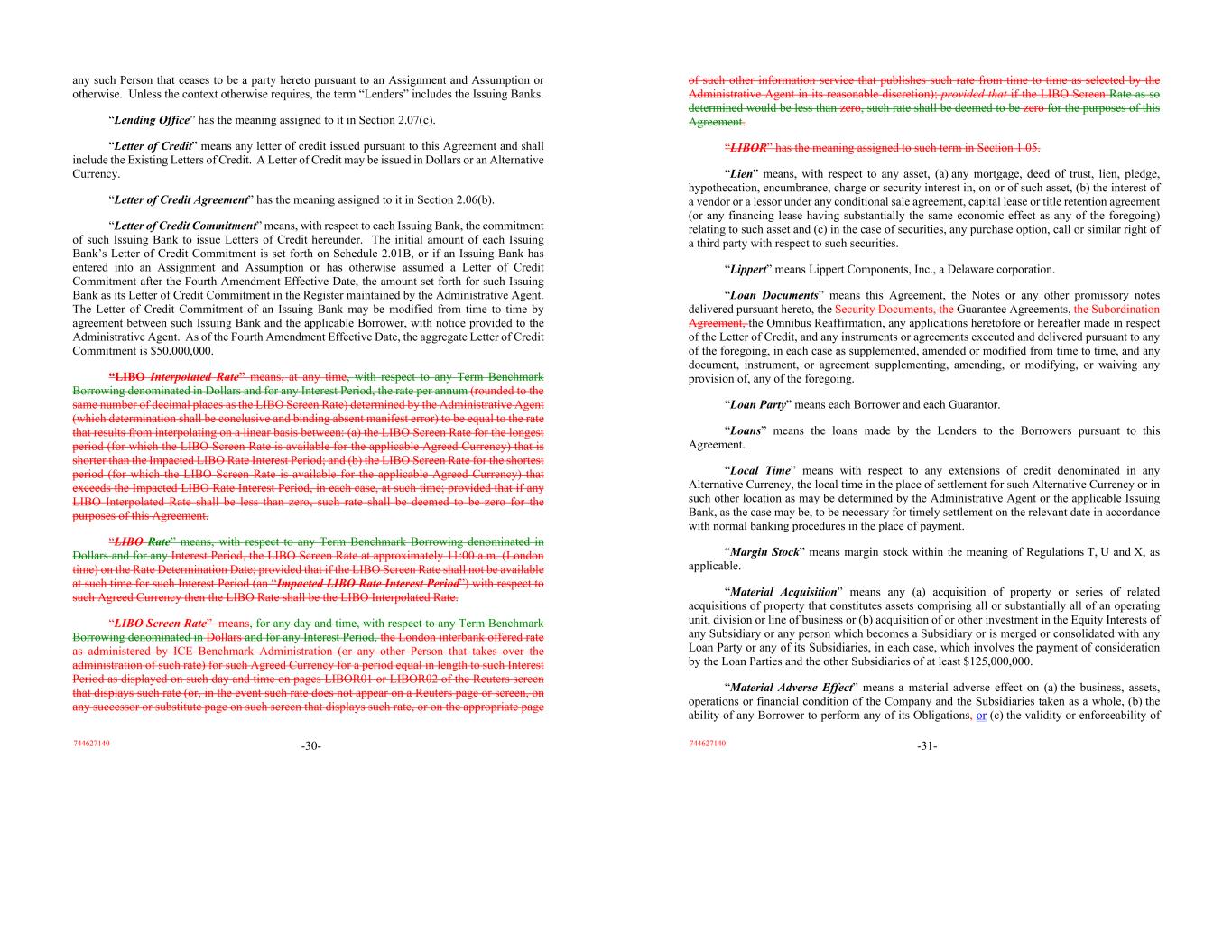 744627140 -30- any such Person that ceases to be a party hereto pursuant to an Assignment and Assumption or otherwise. Unless the context otherwise requires, the term “Lenders” includes the Issuing Banks. “Lending Office” has the meaning assigned to it in Section 2.07(c). “Letter of Credit” means any letter of credit issued pursuant to this Agreement and shall include the Existing Letters of Credit. A Letter of Credit may be issued in Dollars or an Alternative Currency. “Letter of Credit Agreement” has the meaning assigned to it in Section 2.06(b). “Letter of Credit Commitment” means, with respect to each Issuing Bank, the commitment of such Issuing Bank to issue Letters of Credit hereunder. The initial amount of each Issuing Bank’s Letter of Credit Commitment is set forth on Schedule 2.01B, or if an Issuing Bank has entered into an Assignment and Assumption or has otherwise assumed a Letter of Credit Commitment after the Fourth Amendment Effective Date, the amount set forth for such Issuing Bank as its Letter of Credit Commitment in the Register maintained by the Administrative Agent. The Letter of Credit Commitment of an Issuing Bank may be modified from time to time by agreement between such Issuing Bank and the applicable Borrower, with notice provided to the Administrative Agent. As of the Fourth Amendment Effective Date, the aggregate Letter of Credit Commitment is $50,000,000. “LIBO Interpolated Rate” means, at any time, with respect to any Term Benchmark Borrowing denominated in Dollars and for any Interest Period, the rate per annum (rounded to the same number of decimal places as the LIBO Screen Rate) determined by the Administrative Agent (which determination shall be conclusive and binding absent manifest error) to be equal to the rate that results from interpolating on a linear basis between: (a) the LIBO Screen Rate for the longest period (for which the LIBO Screen Rate is available for the applicable Agreed Currency) that is shorter than the Impacted LIBO Rate Interest Period; and (b) the LIBO Screen Rate for the shortest period (for which the LIBO Screen Rate is available for the applicable Agreed Currency) that exceeds the Impacted LIBO Rate Interest Period, in each case, at such time; provided that if any LIBO Interpolated Rate shall be less than zero, such rate shall be deemed to be zero for the purposes of this Agreement. “LIBO Rate” means, with respect to any Term Benchmark Borrowing denominated in Dollars and for any Interest Period, the LIBO Screen Rate at approximately 11:00 a.m. (London time) on the Rate Determination Date; provided that if the LIBO Screen Rate shall not be available at such time for such Interest Period (an “Impacted LIBO Rate Interest Period”) with respect to such Agreed Currency then the LIBO Rate shall be the LIBO Interpolated Rate. “LIBO Screen Rate” means, for any day and time, with respect to any Term Benchmark Borrowing denominated in Dollars and for any Interest Period, the London interbank offered rate as administered by ICE Benchmark Administration (or any other Person that takes over the administration of such rate) for such Agreed Currency for a period equal in length to such Interest Period as displayed on such day and time on pages LIBOR01 or LIBOR02 of the Reuters screen that displays such rate (or, in the event such rate does not appear on a Reuters page or screen, on any successor or substitute page on such screen that displays such rate, or on the appropriate page 744627140 -31- of such other information service that publishes such rate from time to time as selected by the Administrative Agent in its reasonable discretion); provided that if the LIBO Screen Rate as so determined would be less than zero, such rate shall be deemed to be zero for the purposes of this Agreement. “LIBOR” has the meaning assigned to such term in Section 1.05. “Lien” means, with respect to any asset, (a) any mortgage, deed of trust, lien, pledge, hypothecation, encumbrance, charge or security interest in, on or of such asset, (b) the interest of a vendor or a lessor under any conditional sale agreement, capital lease or title retention agreement (or any financing lease having substantially the same economic effect as any of the foregoing) relating to such asset and (c) in the case of securities, any purchase option, call or similar right of a third party with respect to such securities. “Lippert” means Lippert Components, Inc., a Delaware corporation. “Loan Documents” means this Agreement, the Notes or any other promissory notes delivered pursuant hereto, the Security Documents, the Guarantee Agreements, the Subordination Agreement, the Omnibus Reaffirmation, any applications heretofore or hereafter made in respect of the Letter of Credit, and any instruments or agreements executed and delivered pursuant to any of the foregoing, in each case as supplemented, amended or modified from time to time, and any document, instrument, or agreement supplementing, amending, or modifying, or waiving any provision of, any of the foregoing. “Loan Party” means each Borrower and each Guarantor. “Loans” means the loans made by the Lenders to the Borrowers pursuant to this Agreement. “Local Time” means with respect to any extensions of credit denominated in any Alternative Currency, the local time in the place of settlement for such Alternative Currency or in such other location as may be determined by the Administrative Agent or the applicable Issuing Bank, as the case may be, to be necessary for timely settlement on the relevant date in accordance with normal banking procedures in the place of payment. “Margin Stock” means margin stock within the meaning of Regulations T, U and X, as applicable. “Material Acquisition” means any (a) acquisition of property or series of related acquisitions of property that constitutes assets comprising all or substantially all of an operating unit, division or li