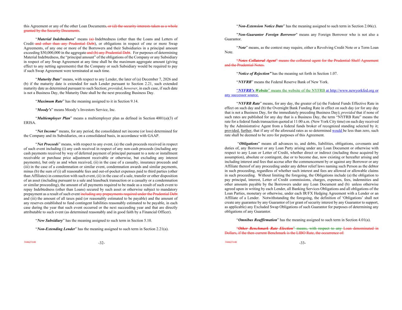744627140 -32- this Agreement or any of the other Loan Documents, or (d) the security interests taken as a whole granted by the Security Documents. “Material Indebtedness” means (a) Indebtedness (other than the Loans and Letters of Credit and other than any Prudential Debt), or obligations in respect of one or more Swap Agreements, of any one or more of the Borrowers and their Subsidiaries in a principal amount exceeding $50,000,000 in the aggregate and (b) any Prudential Debt. For purposes of determining Material Indebtedness, the “principal amount” of the obligations of the Company or any Subsidiary in respect of any Swap Agreement at any time shall be the maximum aggregate amount (giving effect to any netting agreements) that the Company or such Subsidiary would be required to pay if such Swap Agreement were terminated at such time. “Maturity Date” means, with respect to any Lender, the later of (a) December 7, 2026 and (b) if the maturity date is extended for such Lender pursuant to Section 2.21, such extended maturity date as determined pursuant to such Section; provided, however, in each case, if such date is not a Business Day, the Maturity Date shall be the next preceding Business Day. “Maximum Rate” has the meaning assigned to it in Section 9.14. “Moody’s” means Moody’s Investors Service, Inc. “Multiemployer Plan” means a multiemployer plan as defined in Section 4001(a)(3) of ERISA. “Net Income” means, for any period, the consolidated net income (or loss) determined for the Company and its Subsidiaries, on a consolidated basis, in accordance with GAAP. “Net Proceeds” means, with respect to any event, (a) the cash proceeds received in respect of such event including (i) any cash received in respect of any non-cash proceeds (including any cash payments received by way of deferred payment of principal pursuant to a note or installment receivable or purchase price adjustment receivable or otherwise, but excluding any interest payments), but only as and when received, (ii) in the case of a casualty, insurance proceeds and (iii) in the case of a condemnation or similar event, condemnation awards and similar payments, minus (b) the sum of (i) all reasonable fees and out-of-pocket expenses paid to third parties (other than Affiliates) in connection with such event, (ii) in the case of a sale, transfer or other disposition of an asset (including pursuant to a sale and leaseback transaction or a casualty or a condemnation or similar proceeding), the amount of all payments required to be made as a result of such event to repay Indebtedness (other than Loans) secured by such asset or otherwise subject to mandatory prepayment as a result of such event including any prepayments required under the Prudential Debt and (iii) the amount of all taxes paid (or reasonably estimated to be payable) and the amount of any reserves established to fund contingent liabilities reasonably estimated to be payable, in each case during the year that such event occurred or the next succeeding year and that are directly attributable to such event (as determined reasonably and in good faith by a Financial Officer). “New Subsidiary” has the meaning assigned to such term in Section 5.10. “Non-Extending Lender” has the meaning assigned to such term in Section 2.21(a). 744627140 -33- “Non-Extension Notice Date” has the meaning assigned to such term in Section 2.06(c). "Non-Guarantor Foreign Borrower" means any Foreign Borrower who is not also a Guarantor. “Note” means, as the context may require, either a Revolving Credit Note or a Term Loan Note. “Notes Collateral Agent” means the collateral agent for the Prudential Shelf Agreement and the Prudential Notes. “Notice of Rejection” has the meaning set forth in Section 1.07. “NYFRB” means the Federal Reserve Bank of New York. “NYFRB’s Website” means the website of the NYFRB at http://www.newyorkfed.org or any successor source. “NYFRB Rate” means, for any day, the greater of (a) the Federal Funds Effective Rate in effect on such day and (b) the Overnight Bank Funding Rate in effect on such day (or for any day that is not a Business Day, for the immediately preceding Business Day); provided that if none of such rates are published for any day that is a Business Day, the term “NYFRB Rate” means the rate for a federal funds transaction quoted at 11:00 a.m. (New York City time) on such day received by the Administrative Agent from a federal funds broker of recognized standing selected by it; provided, further, that if any of the aforesaid rates as so determined would be less than zero, such rate shall be deemed to be zero for purposes of this Agreement. “Obligations” means all advances to, and debts, liabilities, obligations, covenants and duties of, any Borrower or any Loan Party arising under any Loan Document or otherwise with respect to any Loan or Letter of Credit, whether direct or indirect (including those acquired by assumption), absolute or contingent, due or to become due, now existing or hereafter arising and including interest and fees that accrue after the commencement by or against any Borrower or any Affiliate thereof of any proceeding under any debtor relief laws naming such Person as the debtor in such proceeding, regardless of whether such interest and fees are allowed or allowable claims in such proceeding. Without limiting the foregoing, the Obligations include (a) the obligation to pay principal, interest, Letter of Credit commissions, charges, expenses, fees, indemnities and other amounts payable by the Borrowers under any Loan Document and (b) unless otherwise agreed upon in writing by each Lender, all Banking Services Obligations and all obligations of the Loan Parties, monetary or otherwise, under each IR/FX Hedging Agreement with a Lender or an Affiliate of a Lender. Notwithstanding the foregoing, the definition of ‘Obligations’ shall not create any guarantee by any