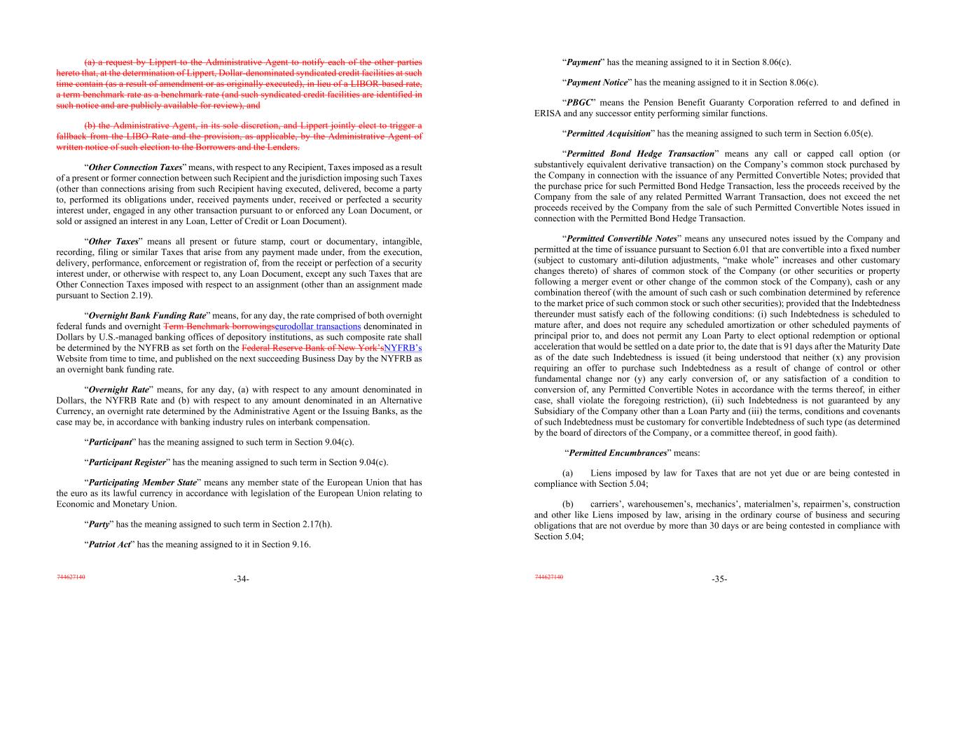 744627140 -34- (a) a request by Lippert to the Administrative Agent to notify each of the other parties hereto that, at the determination of Lippert, Dollar-denominated syndicated credit facilities at such time contain (as a result of amendment or as originally executed), in lieu of a LIBOR-based rate, a term benchmark rate as a benchmark rate (and such syndicated credit facilities are identified in such notice and are publicly available for review), and (b) the Administrative Agent, in its sole discretion, and Lippert jointly elect to trigger a fallback from the LIBO Rate and the provision, as applicable, by the Administrative Agent of written notice of such election to the Borrowers and the Lenders. “Other Connection Taxes” means, with respect to any Recipient, Taxes imposed as a result of a present or former connection between such Recipient and the jurisdiction imposing such Taxes (other than connections arising from such Recipient having executed, delivered, become a party to, performed its obligations under, received payments under, received or perfected a security interest under, engaged in any other transaction pursuant to or enforced any Loan Document, or sold or assigned an interest in any Loan, Letter of Credit or Loan Document). “Other Taxes” means all present or future stamp, court or documentary, intangible, recording, filing or similar Taxes that arise from any payment made under, from the execution, delivery, performance, enforcement or registration of, from the receipt or perfection of a security interest under, or otherwise with respect to, any Loan Document, except any such Taxes that are Other Connection Taxes imposed with respect to an assignment (other than an assignment made pursuant to Section 2.19). “Overnight Bank Funding Rate” means, for any day, the rate comprised of both overnight federal funds and overnight Term Benchmark borrowingseurodollar transactions denominated in Dollars by U.S.-managed banking offices of depository institutions, as such composite rate shall be determined by the NYFRB as set forth on the Federal Reserve Bank of New York’sNYFRB’s Website from time to time, and published on the next succeeding Business Day by the NYFRB as an overnight bank funding rate. “Overnight Rate” means, for any day, (a) with respect to any amount denominated in Dollars, the NYFRB Rate and (b) with respect to any amount denominated in an Alternative Currency, an overnight rate determined by the Administrative Agent or the Issuing Banks, as the case may be, in accordance with banking industry rules on interbank compensation. “Participant” has the meaning assigned to such term in Section 9.04(c). “Participant Register” has the meaning assigned to such term in Section 9.04(c). “Participating Member State” means any member state of the European Union that has the euro as its lawful currency in accordance with legislation of the European Union relating to Economic and Monetary Union. “Party” has the meaning assigned to such term in Section 2.17(h). “Patriot Act” has the meaning assigned to it in Section 9.16. 744627140 -35- “Payment” has the meaning assigned to it in Section 8.06(c). “Payment Notice” has the meaning assigned to it in Section 8.06(c). “PBGC” means the Pension Benefit Guaranty Corporation referred to and defined in ERISA and any successor entity performing similar functions. “Permitted Acquisition” has the meaning assigned to such term in Section 6.05(e). “Permitted Bond Hedge Transaction” means any call or capped call option (or substantively equivalent derivative transaction) on the Company’s common stock purchased by the Company in connection with the issuance of any Permitted Convertible Notes; provided that the purchase price for such Permitted Bond Hedge Transaction, less the proceeds received by the Company from the sale of any related Permitted Warrant Transaction, does not exceed the net proceeds received by the Company from the sale of such Permitted Convertible Notes issued in connection with the Permitted Bond Hedge Transaction. “Permitted Convertible Notes” means any unsecured notes issued by the Company and permitted at the time of issuance pursuant to Section 6.01 that are convertible into a fixed number (subject to customary anti-dilution adjustments, “make whole” increases and other customary changes thereto) of shares of common stock of the Company (or other securities or property following a merger event or other change of the common stock of the Company), cash or any combination thereof (with the amount of such cash or such combination determined by reference to the market price of such common stock or such other securities); provided that the Indebtedness thereunder must satisfy each of the following conditions: (i) such Indebtedness is scheduled to mature after, and does not require any scheduled amortization or other scheduled payments of principal prior to, and does not permit any Loan Party to elect optional redemption or optional acceleration that would be settled on a date prior to, the date that is 91 days after the Maturity Date as of the date such Indebtedness is issued (it being understood that neither (x) any provision requiring an offer to purchase such Indebtedness as a result of change of control or other fundamental change nor (y) any early conversion of, or any satisfaction of a condition to conversion of, any Permitted Convertible Notes in accordance with the terms thereof, in either case, shall violate the foregoing restriction), (ii) such Indebtedness is not guaranteed by any Subsidiary of the Company other than a Loan Party and (iii) the terms, conditions and covenants of such Indebtedness must be customary for convertible Indebtedness of such type (as determined by the board of directors of the Company, or a committee thereof, in good faith). “Permitted Encumbrances” means: (a) Liens imposed by law for Taxes that are not yet due or are bein