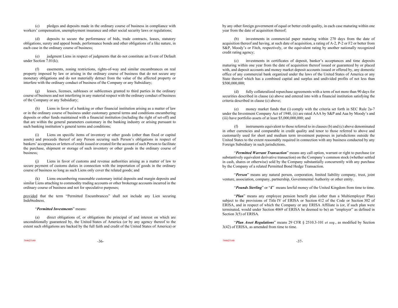 744627140 -36- (c) pledges and deposits made in the ordinary course of business in compliance with workers’ compensation, unemployment insurance and other social security laws or regulations; (d) deposits to secure the performance of bids, trade contracts, leases, statutory obligations, surety and appeal bonds, performance bonds and other obligations of a like nature, in each case in the ordinary course of business; (e) judgment Liens in respect of judgments that do not constitute an Event of Default under Section 7.01(k); (f) easements, zoning restrictions, rights-of-way and similar encumbrances on real property imposed by law or arising in the ordinary course of business that do not secure any monetary obligations and do not materially detract from the value of the affected property or interfere with the ordinary conduct of business of the Company or any Subsidiary; (g) leases, licenses, subleases or sublicenses granted to third parties in the ordinary course of business and not interfering in any material respect with the ordinary conduct of business of the Company or any Subsidiary; (h) Liens in favor of a banking or other financial institution arising as a matter of law or in the ordinary course of business under customary general terms and conditions encumbering deposits or other funds maintained with a financial institution (including the right of set-off) and that are within the general parameters customary in the banking industry or arising pursuant to such banking institution’s general terms and conditions; (i) Liens on specific items of inventory or other goods (other than fixed or capital assets) and proceeds thereof of any Person securing such Person’s obligations in respect of bankers’ acceptances or letters of credit issued or created for the account of such Person to facilitate the purchase, shipment or storage of such inventory or other goods in the ordinary course of business; (j) Liens in favor of customs and revenue authorities arising as a matter of law to secure payment of customs duties in connection with the importation of goods in the ordinary course of business so long as such Liens only cover the related goods; and (k) Liens encumbering reasonable customary initial deposits and margin deposits and similar Liens attaching to commodity trading accounts or other brokerage accounts incurred in the ordinary course of business and not for speculative purposes; provided that the term “Permitted Encumbrances” shall not include any Lien securing Indebtedness. “Permitted Investments” means: (a) direct obligations of, or obligations the principal of and interest on which are unconditionally guaranteed by, the United States of America (or by any agency thereof to the extent such obligations are backed by the full faith and credit of the United States of America) or 744627140 -37- by any other foreign government of equal or better credit quality, in each case maturing within one year from the date of acquisition thereof; (b) investments in commercial paper maturing within 270 days from the date of acquisition thereof and having, at such date of acquisition, a rating of A-2, P-2 or F2 or better from S&P, Moody’s or Fitch, respectively, or the equivalent rating by another nationally recognized credit rating agency; (c) investments in certificates of deposit, banker’s acceptances and time deposits maturing within one year from the date of acquisition thereof issued or guaranteed by or placed with, and deposit accounts and money market deposit accounts issued or offered by, any domestic office of any commercial bank organized under the laws of the United States of America or any State thereof which has a combined capital and surplus and undivided profits of not less than $500,000,000; (d) fully collateralized repurchase agreements with a term of not more than 90 days for securities described in clause (a) above and entered into with a financial institution satisfying the criteria described in clause (c) above; (e) money market funds that (i) comply with the criteria set forth in SEC Rule 2a-7 under the Investment Company Act of 1940, (ii) are rated AAA by S&P and Aaa by Moody’s and (iii) have portfolio assets of at least $5,000,000,000; and (f) instruments equivalent to those referred to in clauses (b) and (c) above denominated in other currencies and comparable in credit quality and tenor to those referred to above and customarily used for short and medium term investment purposes in jurisdictions outside the United States to the extent reasonably required in connection with any business conducted by any Foreign Subsidiary in such jurisdictions. “Permitted Warrant Transaction” means any call option, warrant or right to purchase (or substantively equivalent derivative transaction) on the Company’s common stock (whether settled in cash, shares or otherwise) sold by the Company substantially concurrently with any purchase by the Company of a related Permitted Bond Hedge Transaction. “Person” means any natural person, corporation, limited liability company, trust, joint venture, association, company, partnership, Governmental Authority or other entity. “Pounds Sterling” or “£” means lawful money of the United Kingdom from time to time. “Plan” means any employee pension benefit plan (other than a Multiemployer Plan) subject to the provisions of Title IV of ERISA or Section 412 of the Code or Section 302 of ERISA, and in respect of which the Company or any ERISA Affiliate is (or, if such plan were terminated, would under Section 4069 of ERISA be deemed to be) an “employer” as defined in Section 3(5) of ERISA. “Plan Asset Regulations” means 29 CFR § 2510.3-101 et seq., as modified by Section 3(42) of ERISA, as amended from time to time.